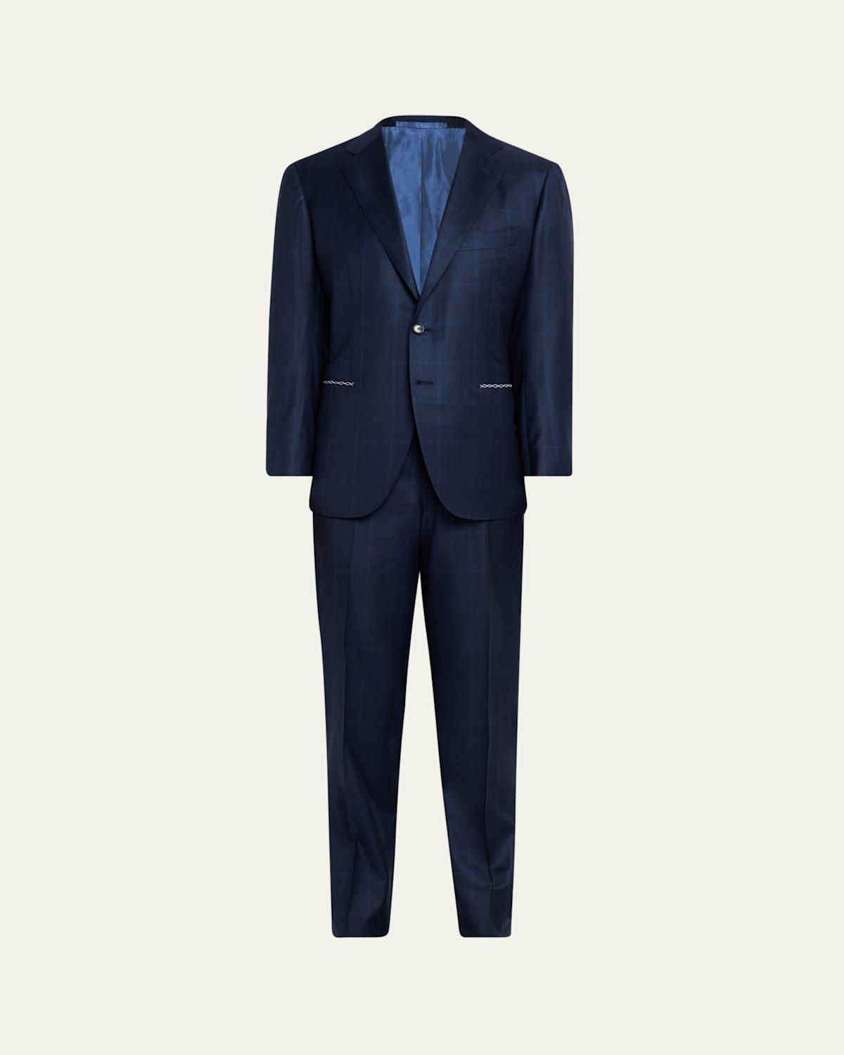 Cesare Attolini suit in tonal plaid Wool/silk Made in Italy Jacket: Notch lapels; buttonhole at left lapel Twobutton closure Chest and hip welt pockets Interior welt pocket Unfinished sleeves Doublevented back Trousers: Regular rise Flat front Side onseam pockets Pressed creases on legs Full length Unfinished hem to be tailored to desired length