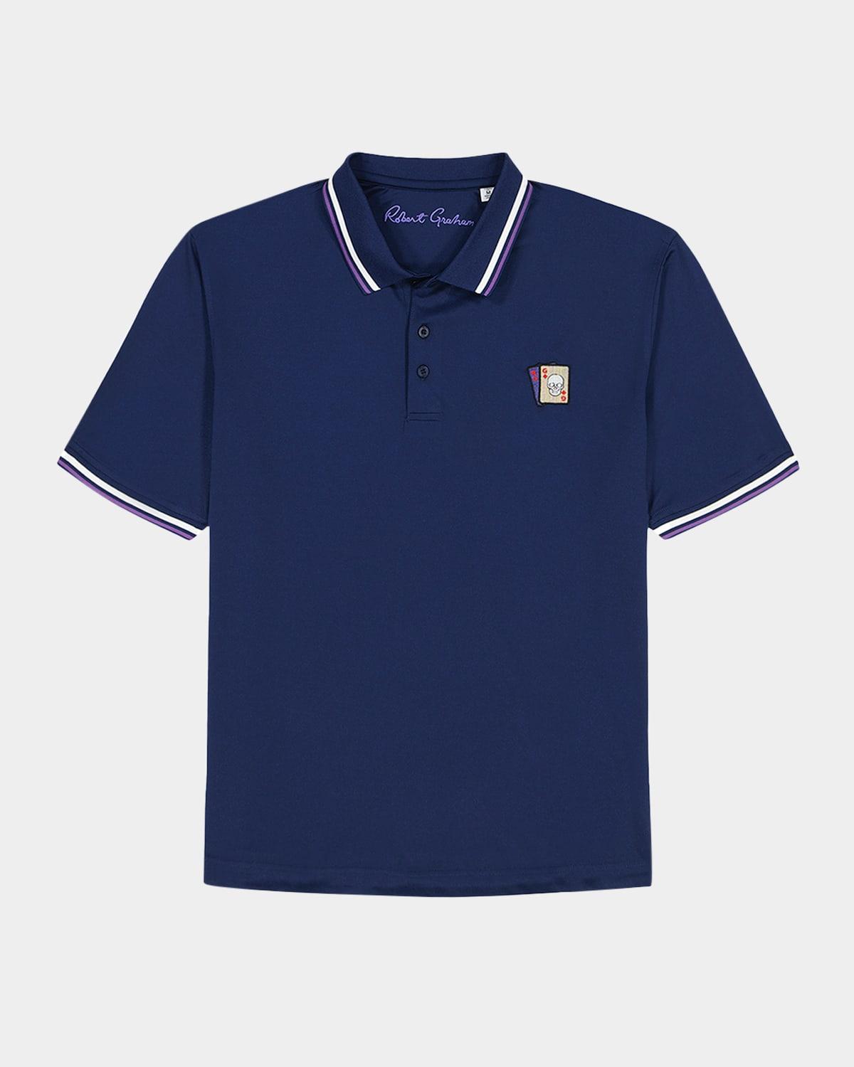 It's poker night and you're ready to go all in thanks to this playful polo in pique. Bring them in for a closer look and show them your winning hand. Colorfully embroidered at the chest, the rg cards are worth the gamble. Robert Graham polo shirt in moisture wicking fabric with UV protection Features RG poker cards embroidered on the left chest Point collar Three-button placket Short sleeves Contrast stripes on the collar and cuffs Uneven vented sides Classic fit Pullover style Polyester/spandex Machine wash cold Imported