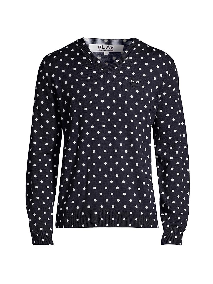 Comme des Garons wool sweater boasts decorative patch detailing. V-neck Long sleeves Rib-knit trim Pulls over 100% wool Dry clean Imported SIZE & FIT About 27 from shoulder to hem Model measurements: 62 tall, 40 chest Model is wearing US size Medium ABOUT THE BRAND From the artistic mind of Comme des Garons designer Rei Kawakubo comes a casual, playful line for women, men and kids. The signature red heart, complete with instantly recognizable wide eyes, is emblazoned on striped and solid T-shirts, knitwear and sneakers. Mens Adv Contemporary - Advanced Contemp Collect > Comme Des Garons Play > Saks Fifth Avenue > Barneys. Comme des Garons PLAY. Color: Black. Size: Small.