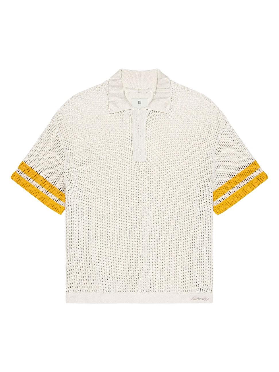 Polo in crochet. Short-sleeved polo shirt in crochet Polo button-down collar Small Givenchy signature embroidered on the lower front Contrasting stripes on bottom sleeves Composition: 70% cotton, 30% polyamide Made in Italy. Lsd Rtw - Givenchy Rtw > Givenchy > Saks Fifth Avenue > Barneys. Givenchy. Color: Beige Orange. Size: Medium.