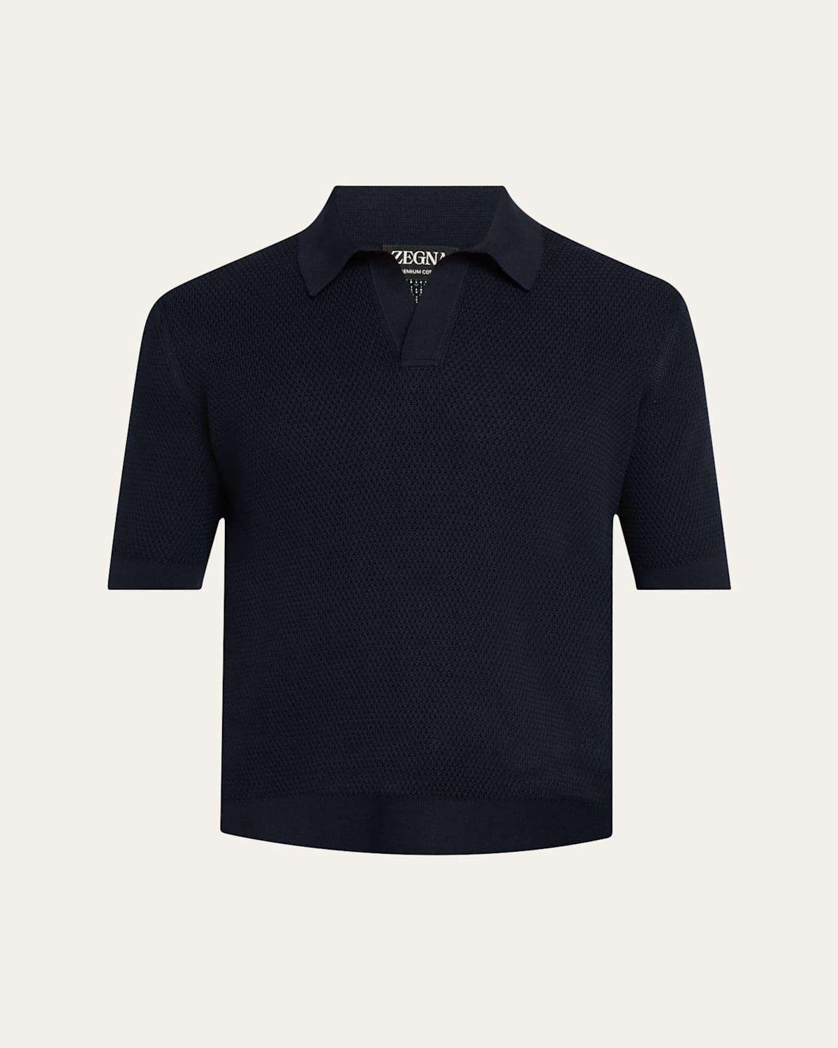 ZEGNA polo sweater crafted from premium cotton showcasing a barley stitch for unique textural interest Johnny collar Short sleeves Ribbed cuffs and hem Pullover style Cotton Dry clean Made in Italy