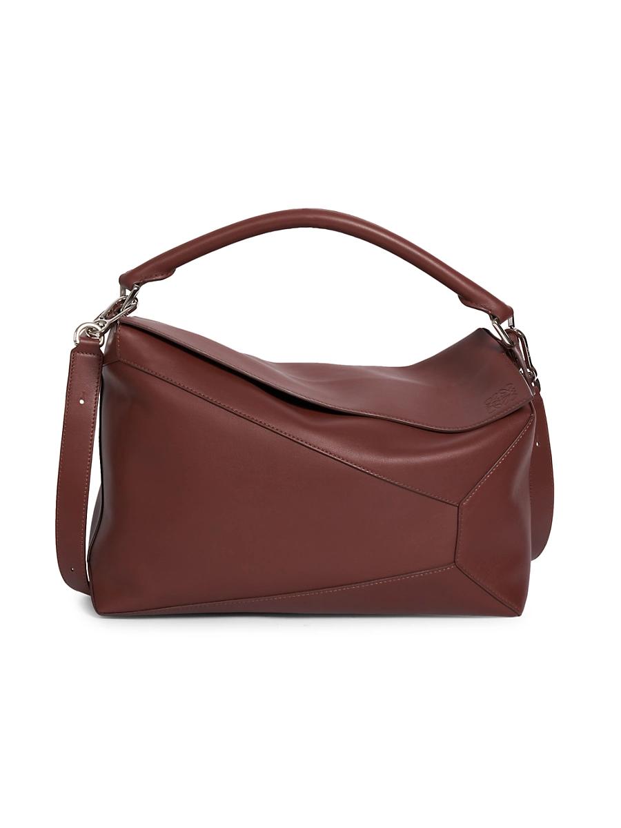 Crafted of Spanish leather, this Loewe shoulder bag features the brands iconic geometric puzzle pattern. An anagram accent adds a finishing touch while metal feet protect the bottom of the bag. Top handle, detachable shoulder strap Flap closure, zipper Exterior back zip pocket 100% leather Made in Spain SIZE About 12.75W x 8.5H. Men Accessories - Designer Accessories > Loewe > Saks Fifth Avenue > Barneys. LOEWE. Color: Black.
