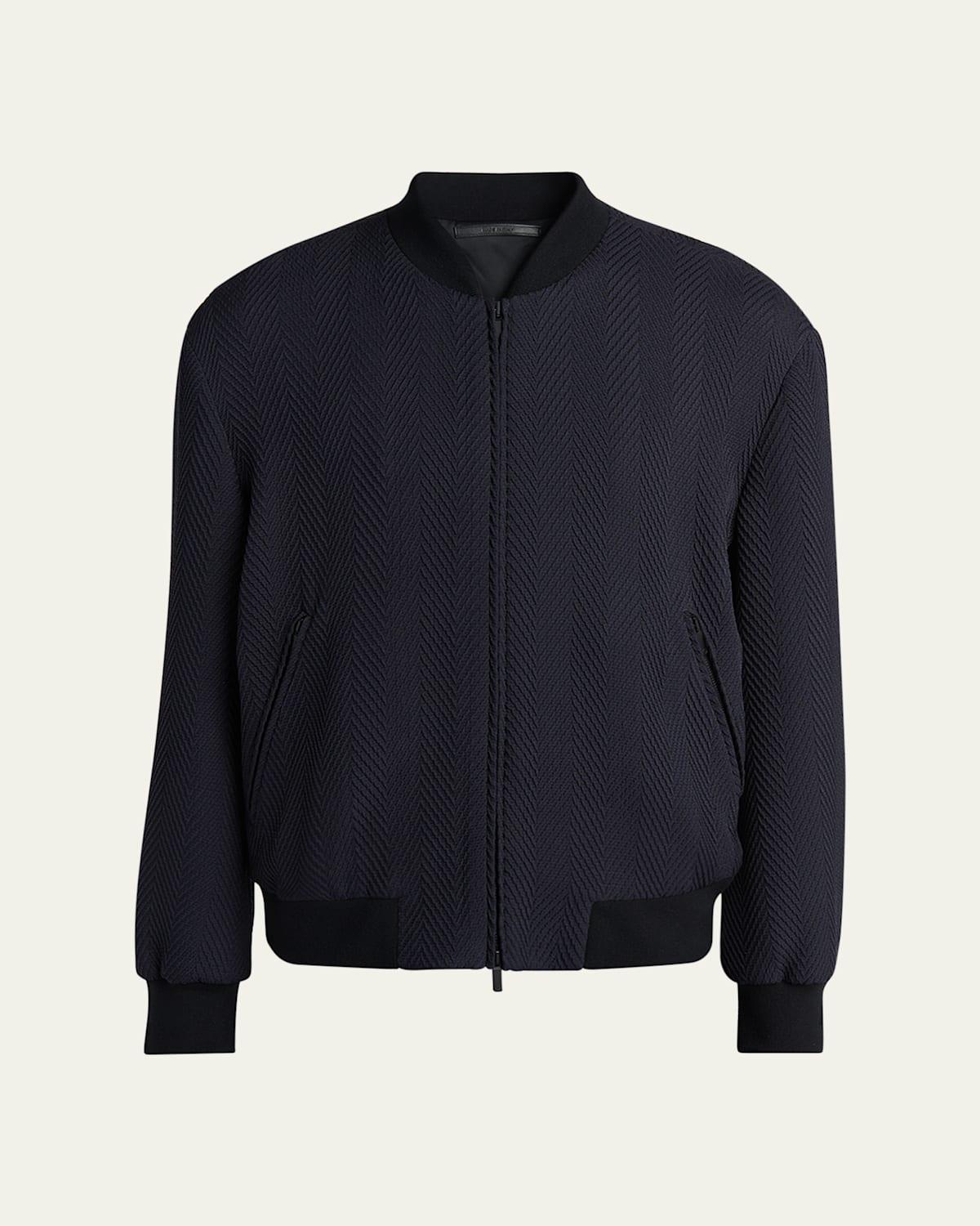Giorgio Armani bomber jacket in raised chevron pattern Baseball collar Two-way zip closure Side zip pockets Long sleeves Banded cuffs and hem Silk/nylon/polyamide Dry clean Made in Italy