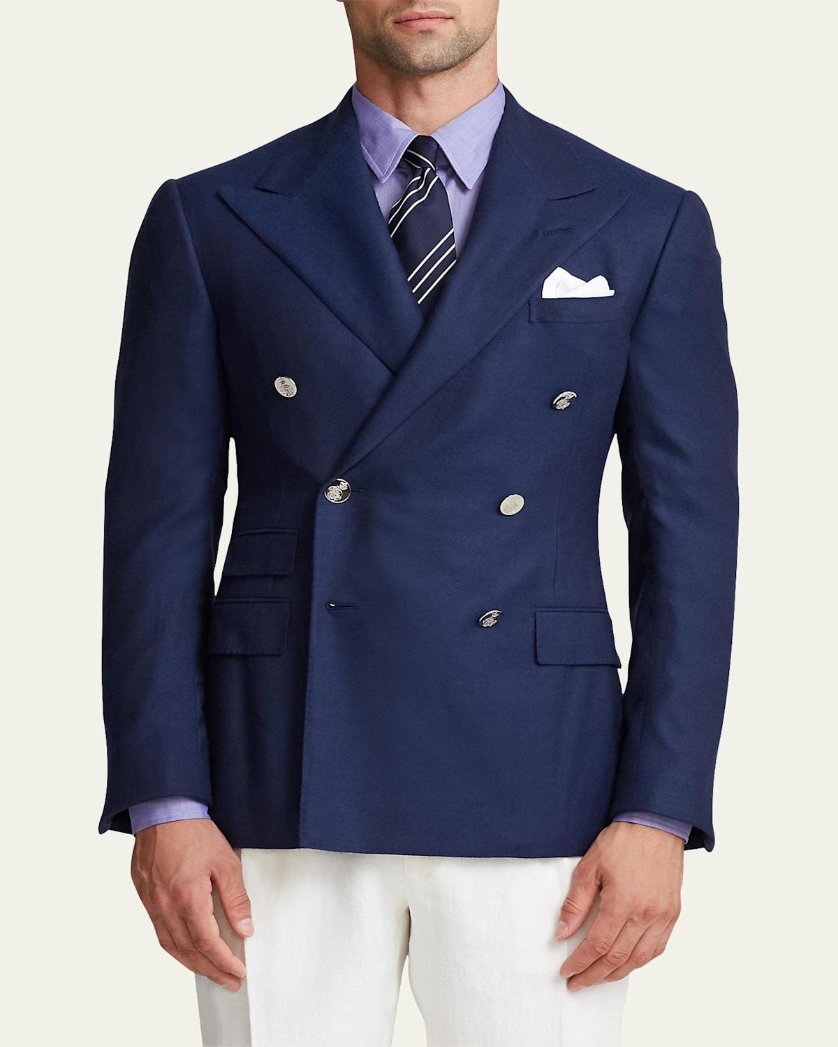 The Ralph jacket is a powerful silhouette directly inspired by Mr. Laurens personal preferences in tailoring It features a wide lapel balanced by a contoured waist and a shorter length The lower stance of the buttons is a signature of Mr. Laurens own doublebreasted suits, which he wears fastened at the bottom button Handcrafted in Italy, this version is developed with Ralph Laurens soft Kent shoulder and realized in luxurious cashmere that was woven at Englands Bower Roebuck mill Size 40R has a 29.75 front body length, a 28.75 back body length, an 18.5 shoulder, and a 17.75 sleeve inseam Soft, roped shoulder Peak lapels Buttonhole at the left lapel Doublebreasted silhouette Silvertone brass buttons engraved with a signature crest Unfinished cuffs ready for customtailoring Left chest welt pocket, ticket pocket, two front waist flapped pockets Two interior chest pockets. Lined at the back yoke and the sleeves Fully canvassed Basted sleeves Cashmere Lining: Cupro Dry clean Made in Italy