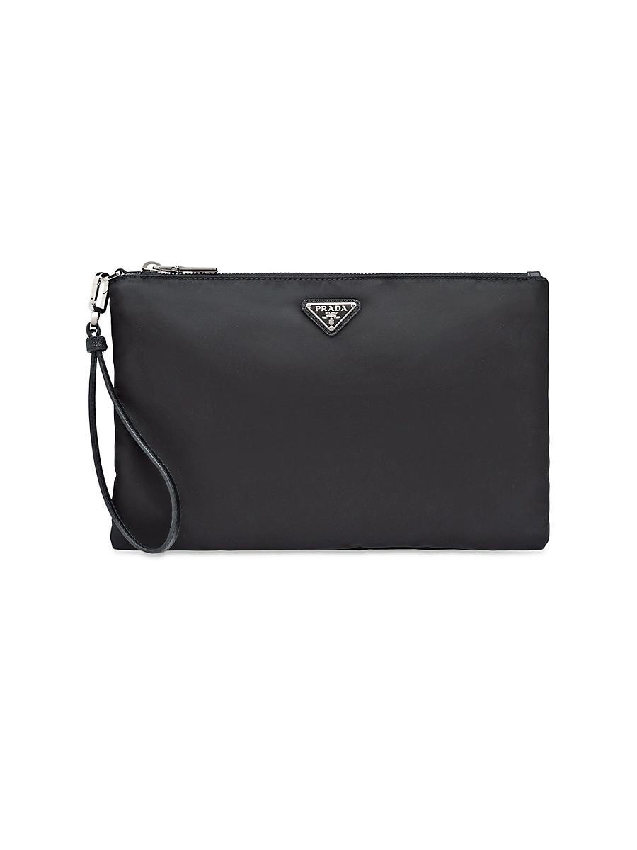 This pouch with a sleek design is made of Re-Nylon, an innovative material produced from recycled, purified plastic trash collected in the ocean, and is completed with details in Saffiano, a fine leather with a crosshatch texture. Two of Pradas emblematic materials, they are combined to give an iconic character to the accessory decorated with the enameled metal triangle logo. Removable leather wristlet Enameled metal triangle logo on the front Zipper closure Interior with card slots Nylon lining Imported This product is not eligible for extended holiday returns SIZE: 28 W x 18 H (cm) / 11 W x 7 H. Lsd Rtw - Prada Rtw > Prada > Saks Fifth Avenue > Barneys. Prada. Color: Black.