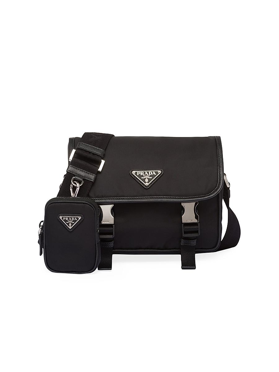 In Prada collections, technologically innovative fabrics meet classic traditional materials to create new designs that blend past and present, luxury and simplicity. This shoulder bag is made of two of the brands most iconic materials: Saffiano leather, synonymous with luxury, a very high quality leather defined by its crosshatch texture, and Re-Nylon, a regenerated nylon yarn produced from recycled, purified plastic materials collected in the ocean, fishing nets, and textile fabrics. Adjustable nylon tape and leather shoulder strap with removable pouch Enameled metal triangle logo on flap Flap closure with side-release buckle External zipper pocket Interior with two zipper pockets and patch pocket Logo-print Re-Nylon lining Imported SIZE: 22 W x 16 H x 8.5 L / 8.6 W x 6.2 H x 3.3 L. Lsd Rtw - Prada Rtw > Prada > Saks Fifth Avenue > Barneys. Prada. Color: Black. Size: 0.