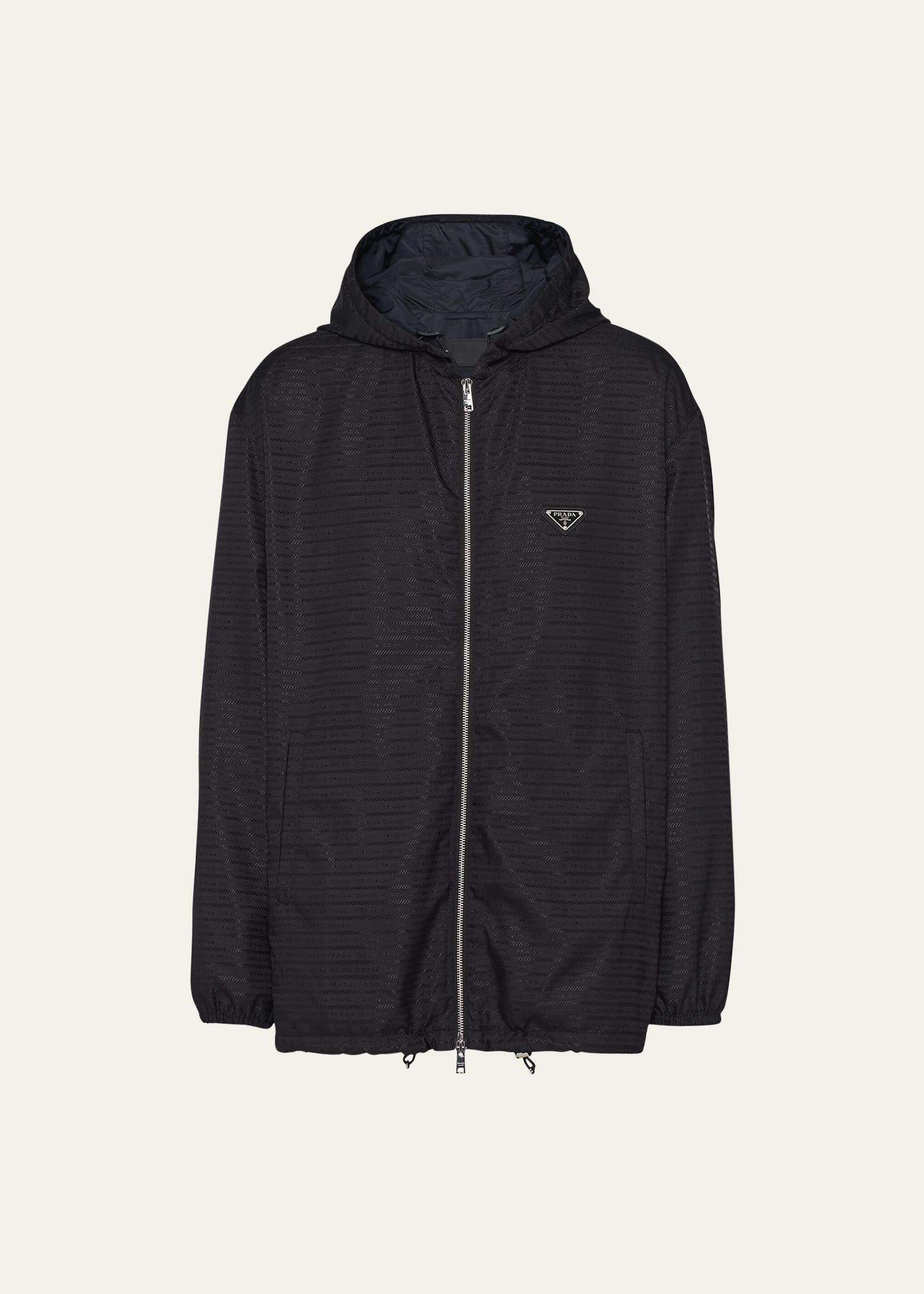 Prada striped jacket in Re-Nylon Re-Nylon is a regenerated yarn produced from recycled plastic trash collected in the ocean Drawcord hood Two-way zip front Signature metal triangle logo Long sleeves Elasticized cuffs Drawcord hem Nylon/polyamide Lining: Recycled nylon Made in Italy