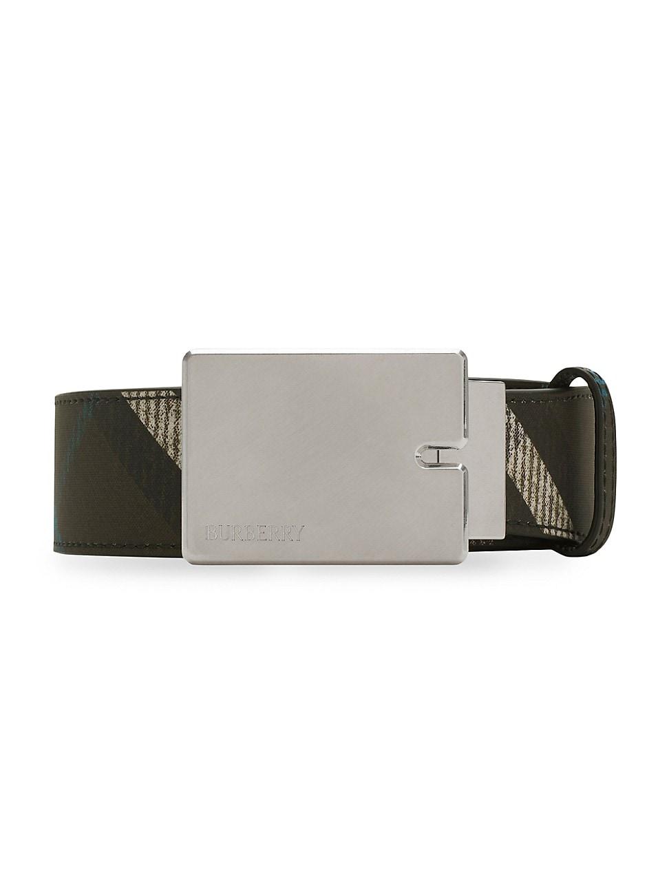 A belt made in Italy from Burberry check canvas and smooth calf leather reversible design. A palladium-plated B-cut buckle is engraved with Burberry lettering. Polished metal hardware Comes with a dust bag 55% polyurethane/25% polyester/20% cotton Lining: 100% calf leather Made in Italy SIZE Width: about 1.4 ABOUT THE BRAND Founded in 1856 by 21-year-old Thomas Burberry, the brand set out with a mission to stylishly protect against British weather-and Burberrys iconic trench coat was born. In the 1920s, its renowned check pattern was introduced as the coats lining. Today, under Creative Director Daniel Lee, the heritage brand continues to evolve and create timelessly classic mens, womens and kids pieces, along with beauty. Men Accessories - Designer Accessories > Burberry > Saks Fifth Avenue > Barneys. Burberry. Color: Snug Black. Size: 32.