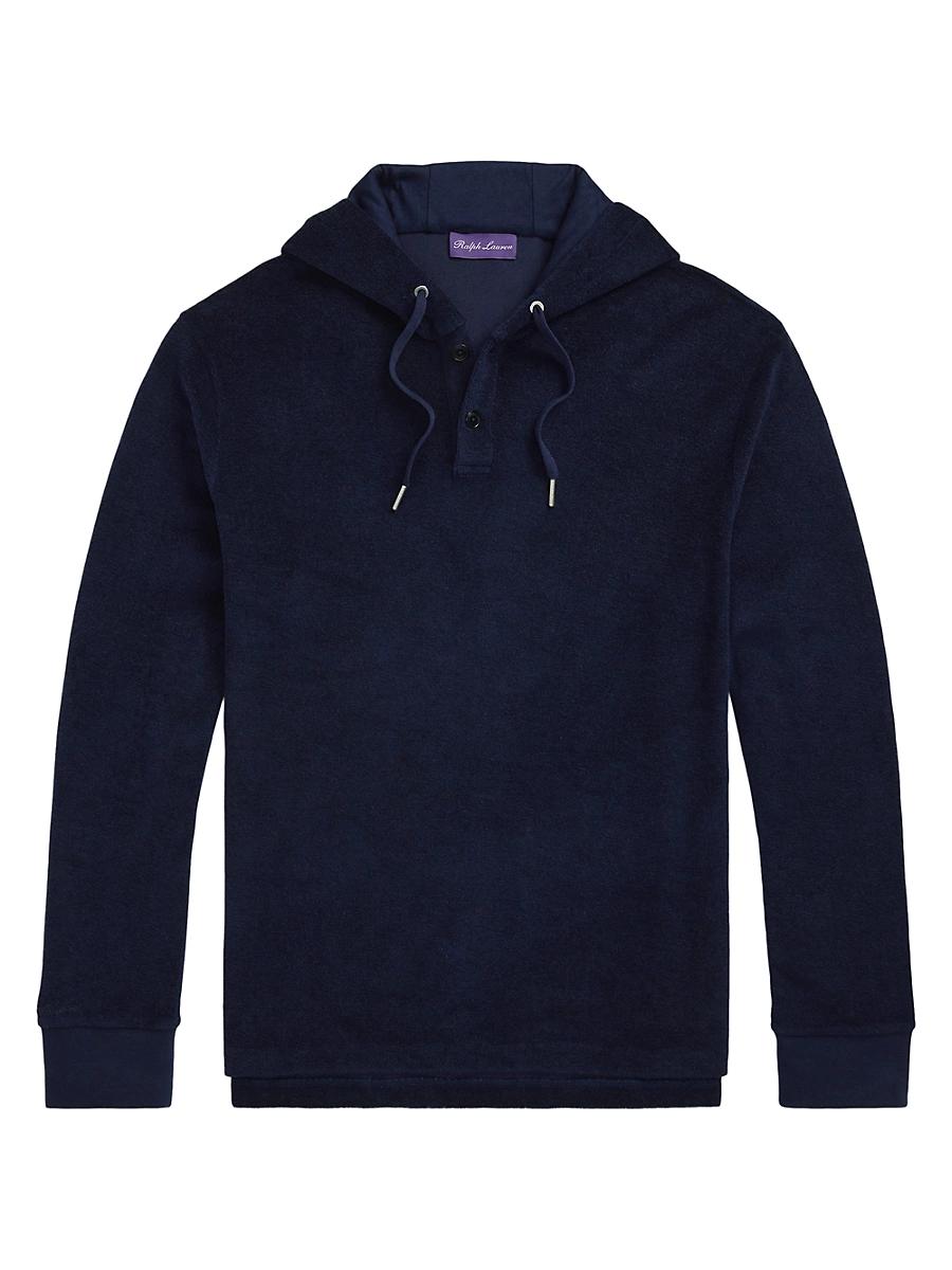 This Ralph Lauren Purple Label hoodie is crafted of plush cotton terry that offers a luxuriously soft texture. The right sleeve is finished with Ralph Lauren script embroidery. Drawstring hood Long sleeves, rib-knit cuffs Front button closure 64% cotton/ 36% modal Trim: 48% cotton/ 48% modal/ 4% elastane Hood lining: 50% cotton 50% modal Machine wash Made in Portugal SIZE & FIT About 27.75 from shoulder to hem Shoulder: about 19.5 Chest: about 44 Sleeve length: about 34.5 Sleeve length is taken from the center back of the neck. Model measurements: 62 tall, 40 chest, 31 waist Model is wearing a US size Medium. Men Luxury Coll - Rl Purple Label > Ralph Lauren Purple Label > Saks Fifth Avenue > Barneys. Ralph Lauren Purple Label. Color: Classic Chairman Navy. Size: Large.