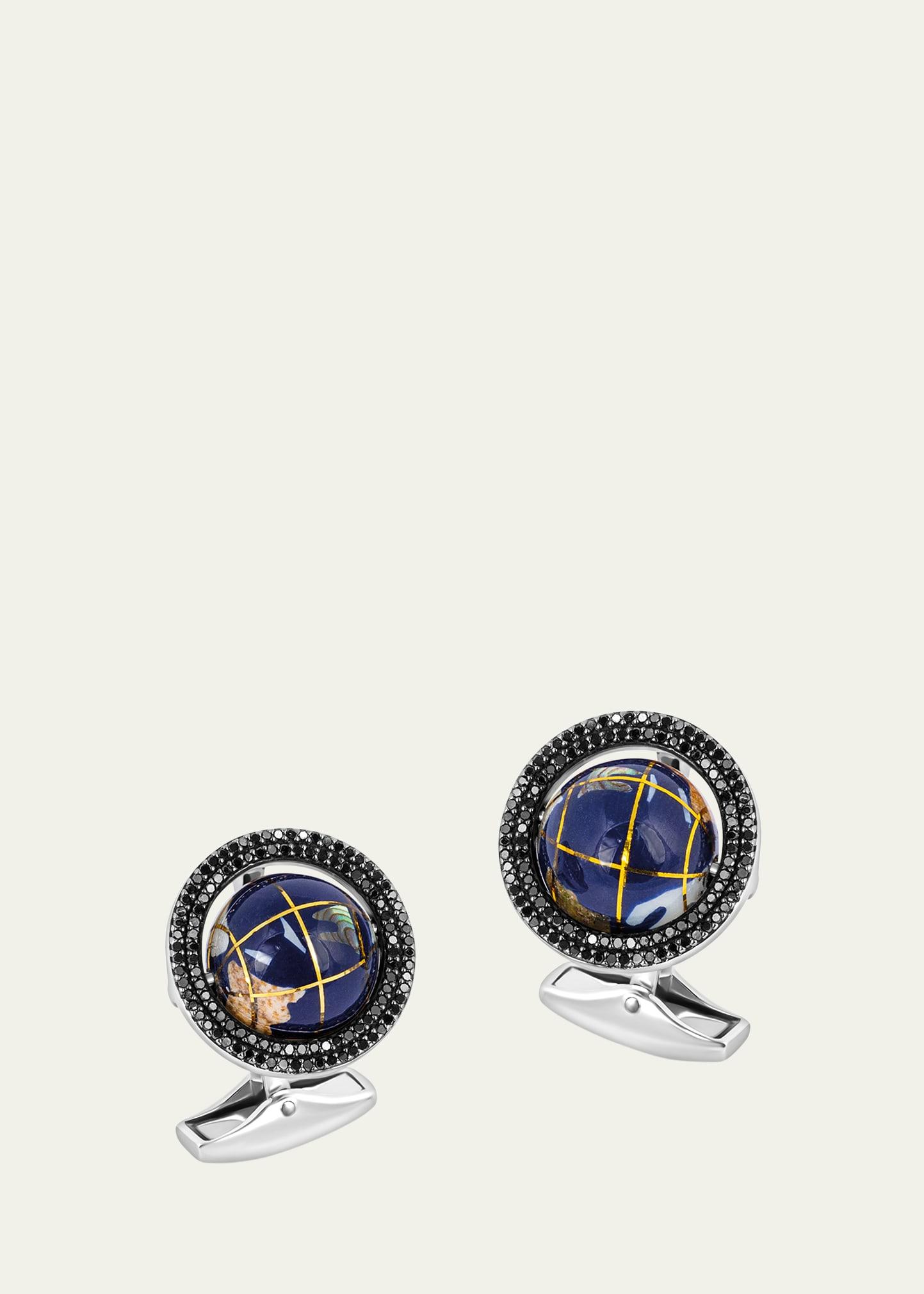 Tateossian cufflinks Approx. 0.6H x 0.59W x 0.2D Rhodium-tone sterling silver Pav round black diamonds; total diamond carat weight: 0.622 Rotating semi-precious globe inlaid with latitudinal and longitudinal lines Logo-engraved whale backs Imported