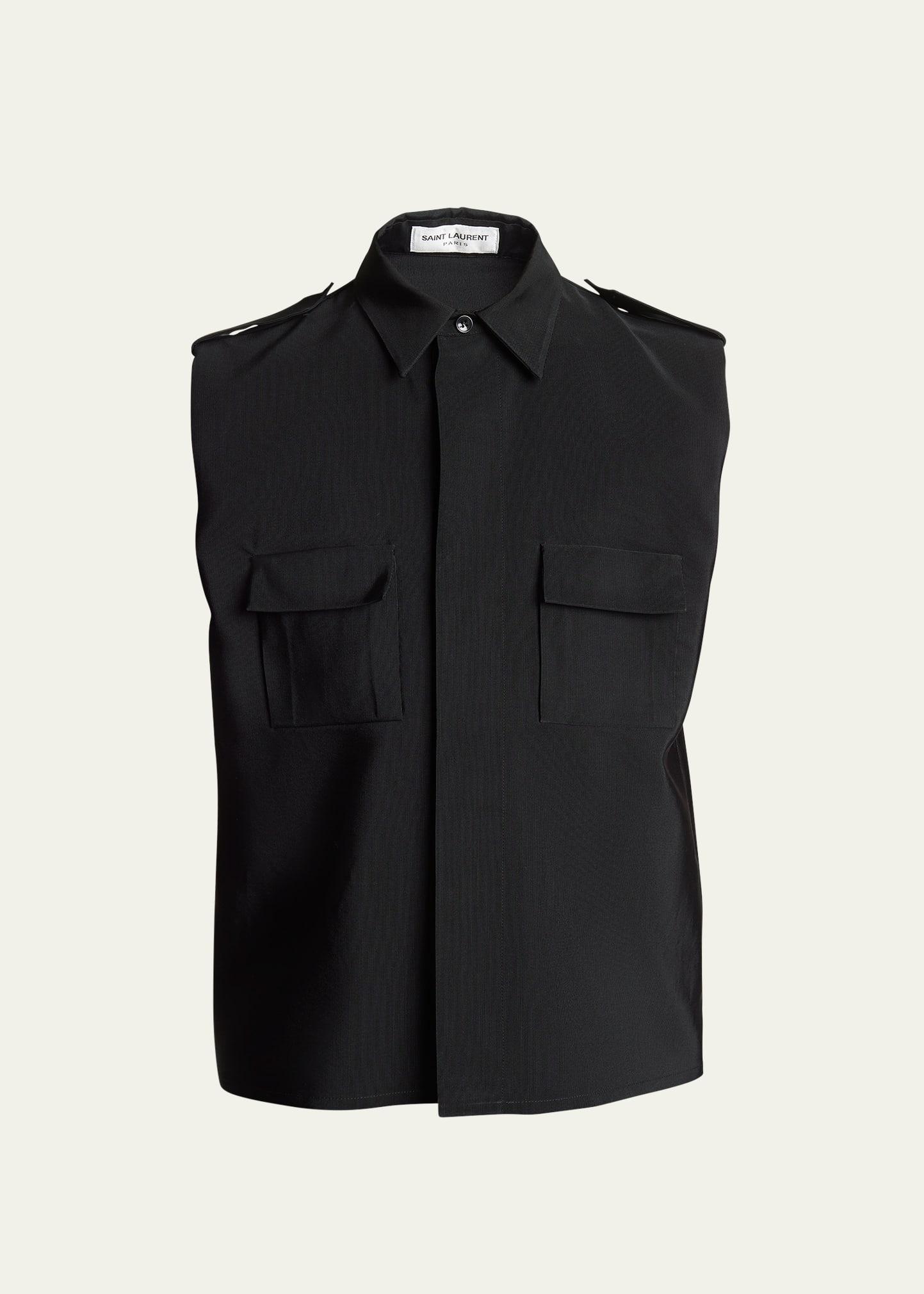 Saint Laurent Sahara shirt in fine stripes Point collar Concealed button placket Shoulder epaulets Two front flap pockets Sleeveless Acetate/wool Made in Italy