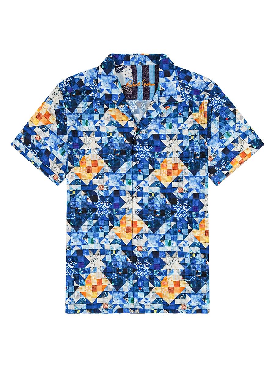Robert Graham Sashiko casual buttondown shirt in an allover printed finish Features the signature contrast pattern on the undercollar Spread collar; button placket Short sleeves; approx. 19L Yoked back shoulders Curved hem Classic fit Cotton/spandex Machine wash Imported
