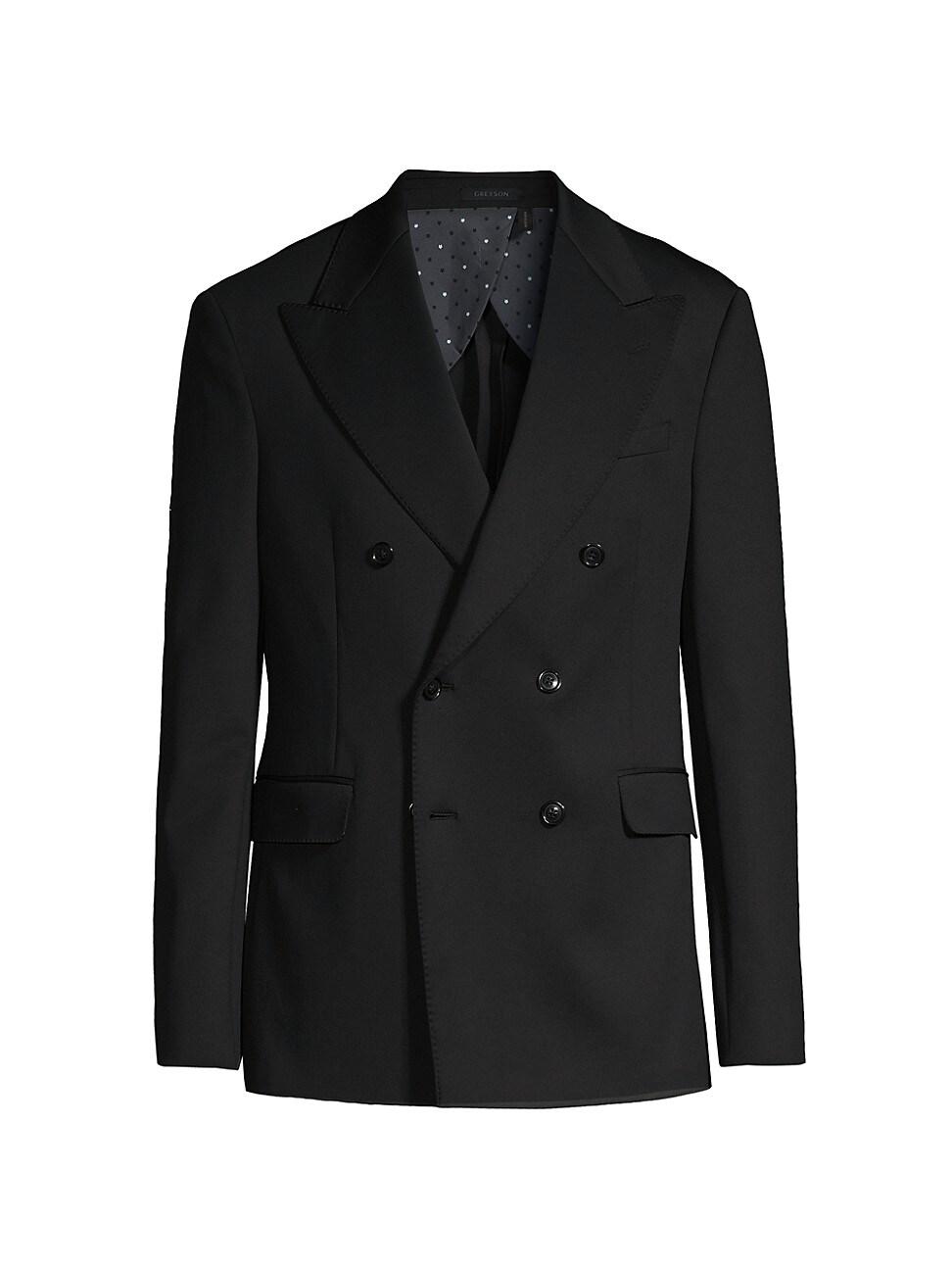 Crafted of cotton blend, the Sequoia blazer from Greyson features a double-breasted silhouette with a three-button closure. Peak lapels and long sleeves with kissing button cuffs complete this style. Peak lapel Long sleeves, kissing button cuffs Chest slip pocket Side flap pockets Double-breasted, three-button closure Dual vents 45% nylon/40% cotton/15% elastane Dry clean Imported SIZE & FIT About 17.75 from shoulder to hem Model measurements: 62 tall, 40 chest Model is wearing US size 40R. Mens Modern Coll & Outer - Active Lifestyle > Greyson > Saks Fifth Avenue > Barneys. Greyson. Color: Shepherd. Size: 38.