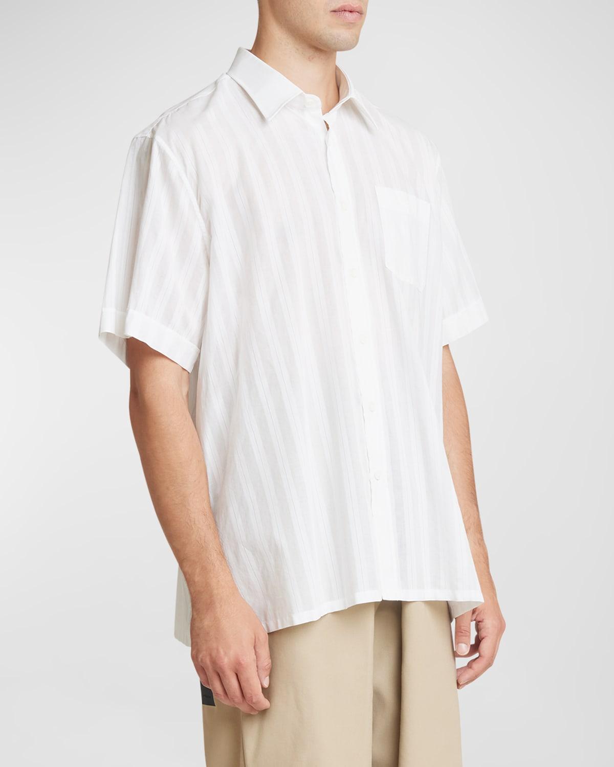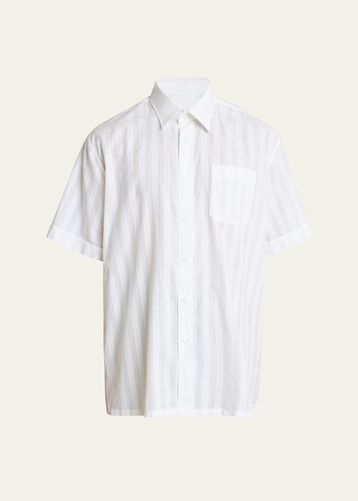 Givenchy sport shirt in semi-sheer stripes Spread collar Button placket Chest patch pocket Short sleeves Oversized fit Cotton Made in Portugal