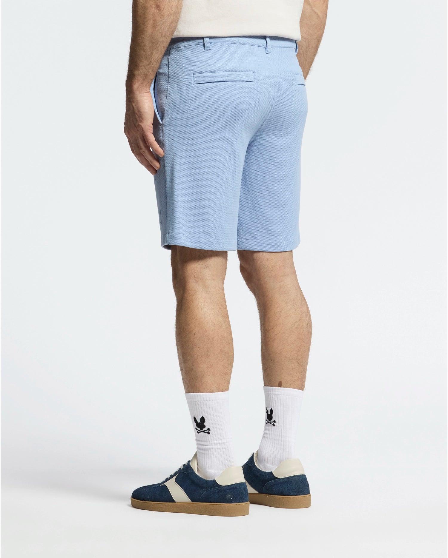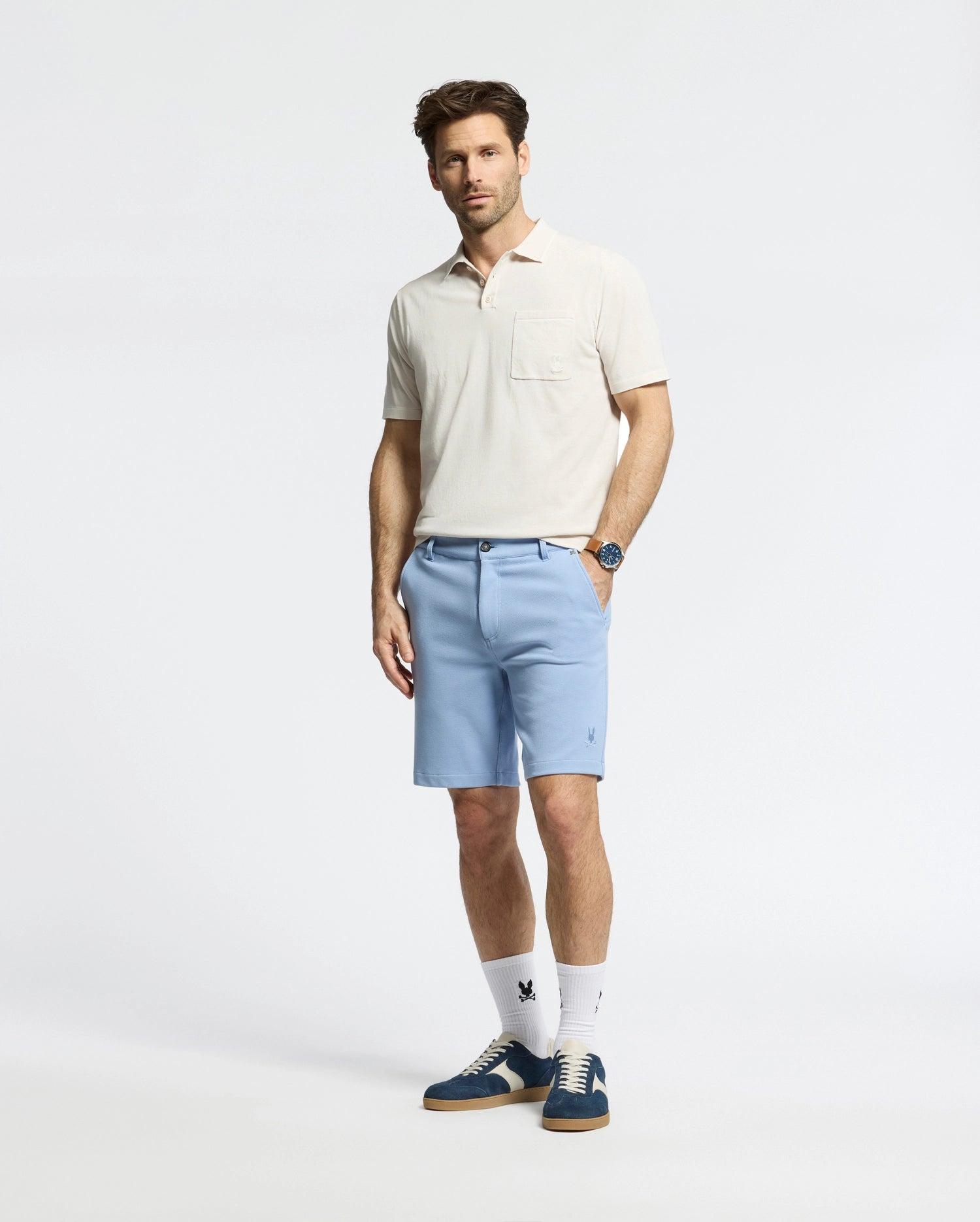 The Shiro shorts are knit in a honeycomb-patterned piqué that is light, stretchy, and feels fantastic. Fit to perfection, it's elevated by thoughtful detailing that adds style. These shorts are the ultimate versatile piece, effortlessly taking you from day to night. Whether you're running errands, heading to brunch, or stepping out for a night on the town, these shorts offer an effortless, stylish transition for any occasion.Knit - 50% Polyamide, 47% viscose, 3% spandexMade in ChinaRegular fitBelt loopsEmbroidered BunnyBunny rivet hardwareThree pocketsInseam 8.5"