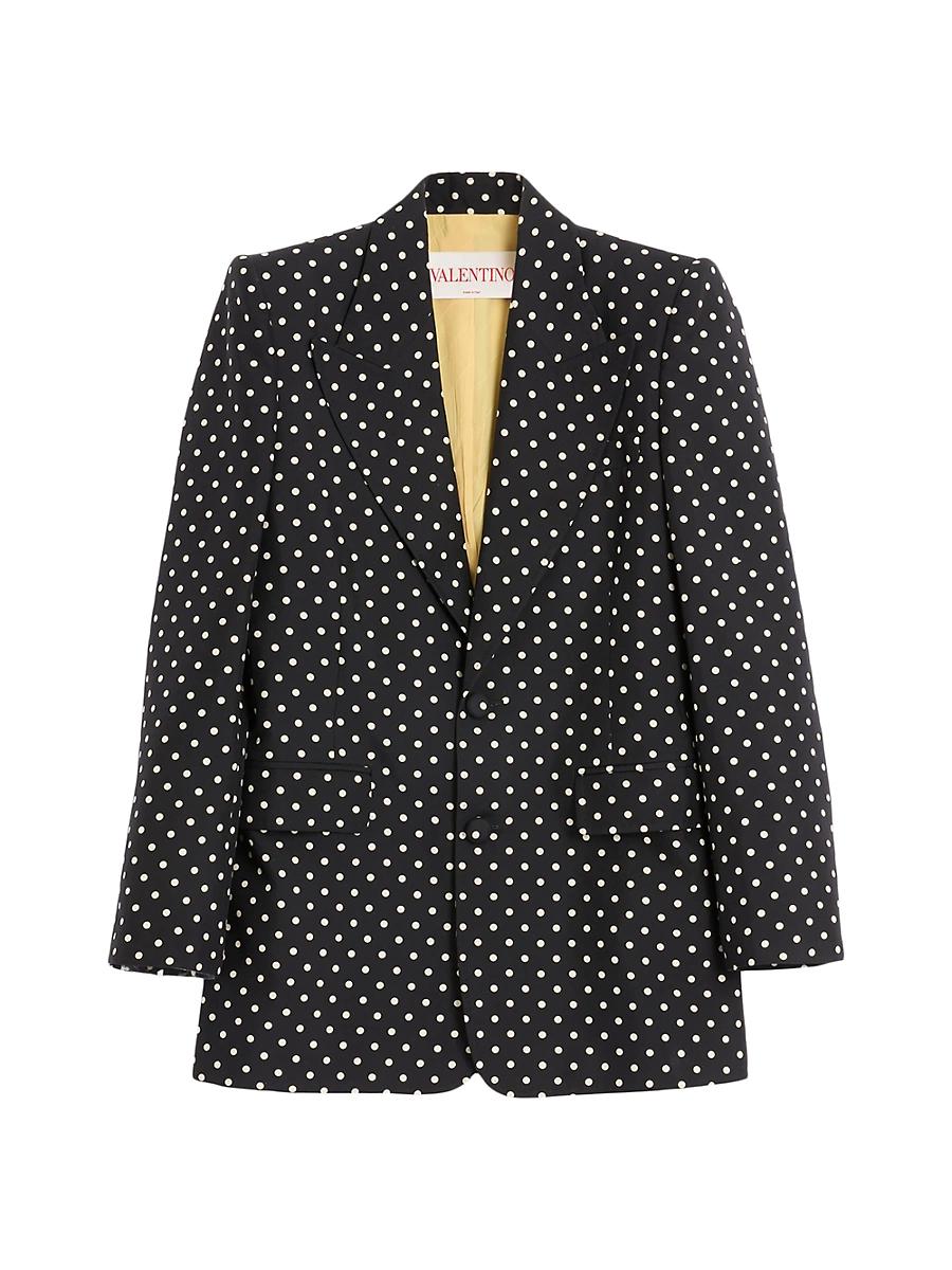 Valentino single breasted jacket in shantung silk with allover Pludepois print. Slim fit Lined Allover Plusdepois print Two front flap pockets Composition: 100% Silk Lining: 75% Acetate, 25% Silk Length: 75 cm / 29.5 in. from the back of the neck in an Italian size 39 The model is 187 cm / 61 tall and wears an Italian size 44 Made in Italy. Lsd Rtw - Valentino Rtw > Valentino Garavani > Saks Fifth Avenue > Barneys. Valentino Garavani. Color: Black. Size: 36.
