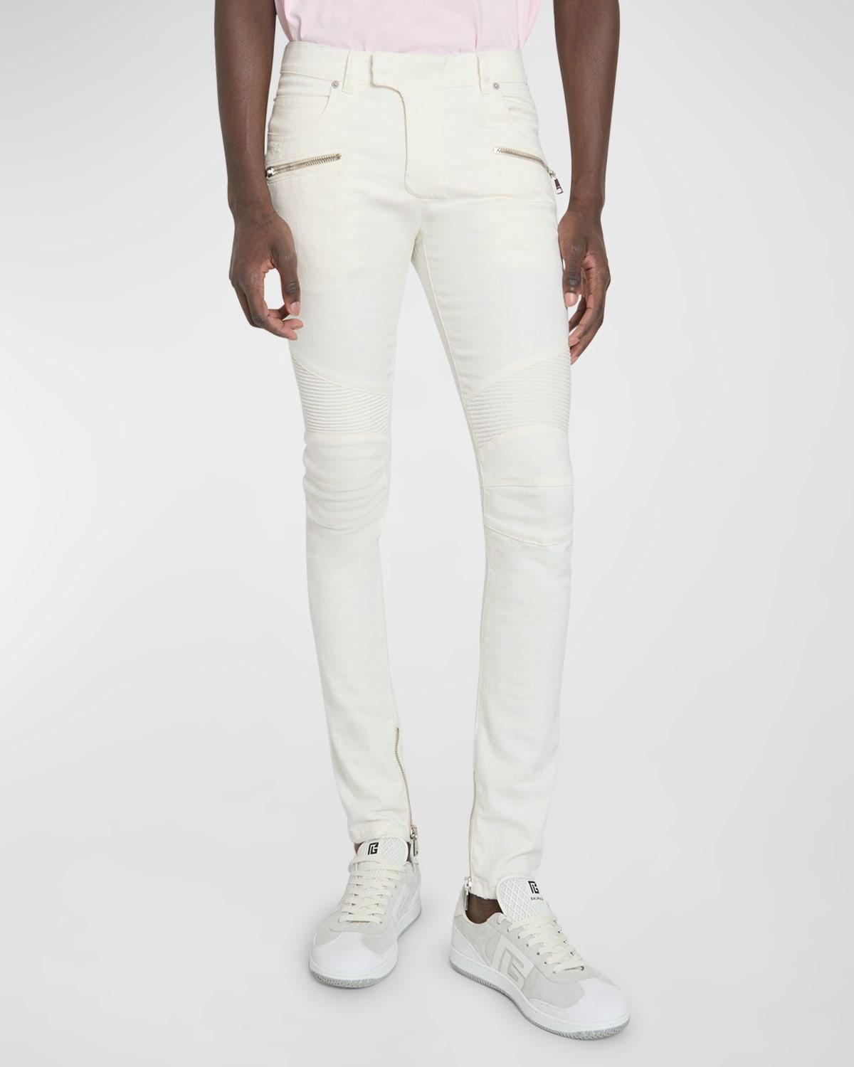 Balmain biker jeans in white denim Waistband with belt loops and a triple belt loop at the back 5 classic pockets 2 visible zip pockets Placket with zip and pressstud fastening Ribbed knees Fitted through skinny legs Visible zip at the ankles Logoengraved hardware Woven label with vintage Balmain logo Full length Cotton/elastane Made in Italy