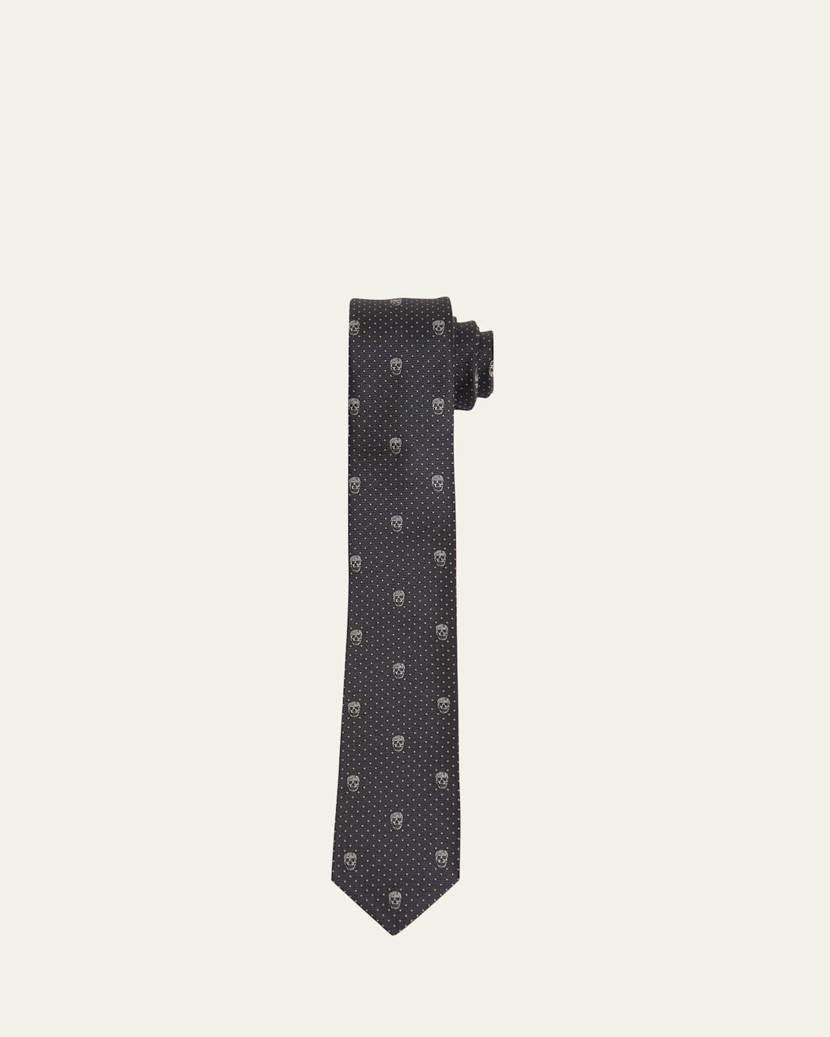 Alexander McQueen Skull Polka Dot Tie in Black & White - Black. Size all. Self: 100% silk Lining: 56% acetate 44% cupro. Made in Italy. Dry clean only. Signature skull and polka dot detail throughout. AMCQ-MA97. 1657244Q053. About the designer: Always the king of controversy, Alexander McQueen was known for runways exotic in clothing, models, and set decor. At a young age, McQueen cut his teeth on Savile Row, where he apprenticed with tailors Anderson & Sheppard and worked for Gieves & Hawkes. He later worked with Koji Tatsuno and Italy's Romeo Gigli before returning to London in 1994 to receive his masters from Central Saint Martins. Style icon Isabella Blow bought McQueen's entire graduation collection, marking the launch of his fashion career. McQueen received several awards and accolades, including the British Designer of the Year, which he won four times, the CBE, and was named International Designer of the Year by the CFDA in 2003. In addition to designing his own line, McQueen also served as head designer for Givenchy and collaborated with PUMA and MAC Cosmetics. McQueen's mainline features eccentric prints, avid use of color, innovative garment structure, and fan list that includes Daphne Guinness, Lady Gaga, and Bjork.