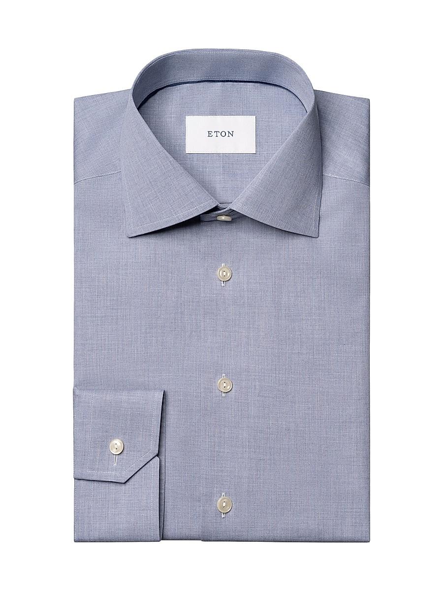 Crafted of high-performance, crease-resistant melange cotton twill, this Eton shirt is cut for a slim fit with back darts for an adjustable width. Convertible barrel-to-French cuffs complete the design. Made with organic cotton Spread collar with permanent stays Long sleeves, convertible barrel-to-French cuffs Button front closure 61% organic cotton/39% cotton Machine wash Imported SIZE & FIT This style is designed for a slim fit Model measurements: 62 tall, 40 chest, 31 waist Model is weari