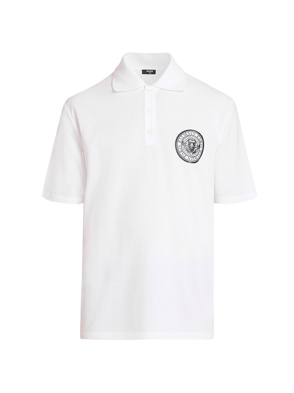 Cut in a relaxed fit, this cotton polo shirt showcases a small coin Balmain logo on the chest and a wide ribbed spread collar. Spread collar Short sleeves Button-front placket 100% cotton Dry clean Made in Italy SIZE & FIT Model measurements: 62 tall, 40 chest Model is wearing a US size Medium. Men Advcd Dsgnr - Advanced Designer Collec > Balmain > Saks Fifth Avenue > Barneys. Balmain. Color: Blanc Noir. Size: XXL.