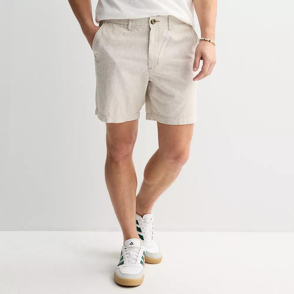 Get ready for the warm weather season with these men's 7-in. Flexwear Flat Front Shorts from Sonoma Goods For Life. Click on this MEN'S GUIDE to find the perfect fit and more! FEATURES Zipper fly with button closure Elastic waistband 2 front pockets, 1 coin pocket, 2 back pockets Stretch twill constructionRESPONSIBLE Supports more sustainable cotton farming Tested for harmful substances STANDARD 100 by OEKO-TEX® CERTIFIED Certification No. 20.HBD.10569 HOHENSTEIN HTTI Testing Institute: Hohenstein Textile Testing Institute www.oeko-tex.com/standard100 FIT & SIZING 7-in. inseam Regular fitFABRIC & CARE 98% cotton (BCI), 2% spandex Machine wash Imported Size: 36 7 IN. Color: Beige Stripe. Gender: male. Age Group: adult.