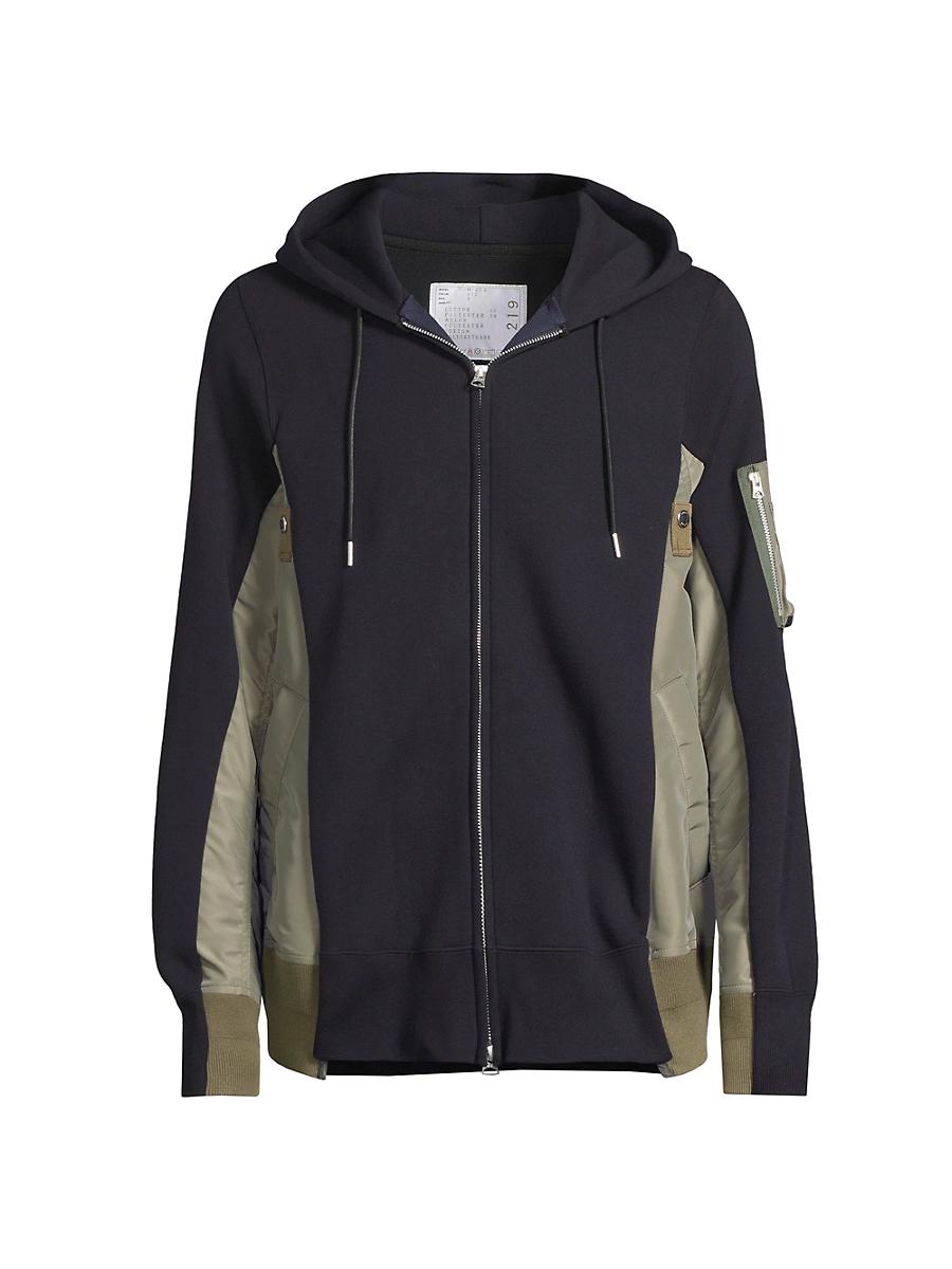 Sacais Sponge Sweat hoodie,crafted in a blend of soft cotton, features contrast nylon panels for a mixed-media effect. An asymmetric hem and side welt pockets complete the look. Drawstring hood Long sleeves, rib-knit cuffs Side welt pockets Rib-knit trim Asymmetric hem 62% cotton/38% polyester Dry clean Made in Japan SIZE & FIT About 30 from shoulder to hem Model measurements: 61 tall, 37 chest, 30.5 waist Model is wearing a US size 40. Men Advcd Dsgnr - Advanced Designer Collec > Sacai > Saks Fifth Avenue > Barneys. Sacai. Color: Navy Khaki. Size: Medium.