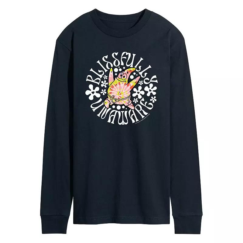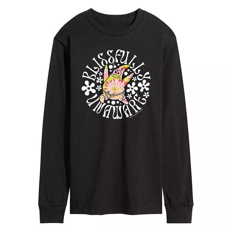 Get the perfect balance of fun and comfort with this Mens SpongeBob SquarePants Blissfully Unaware Long Sleeve Graphic Tee. FEATURES Crewneck Long sleeveFABRIC & CARE Solid Color: Cotton ; Heather Colors: Cotton/Polyester Machine wash Imported Color: Black. Gender: male. Age Group: adult.