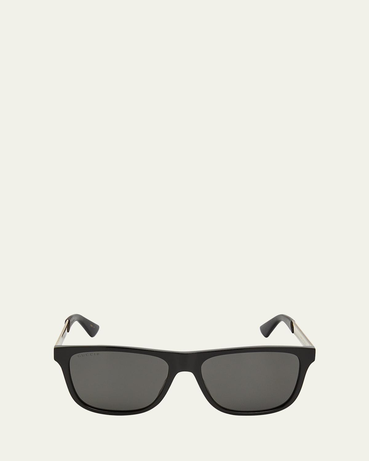Gucci square sunglasses in acetate frames. Eye/bridge/temple (in mm): 5717145. Monochromatic lenses; logo script. Saddle nose bridge. Logo detail at temples. Capped earpieces. 100%25 UVA/UVB protection. May be fitted with prescription lenses. Made in Italy.