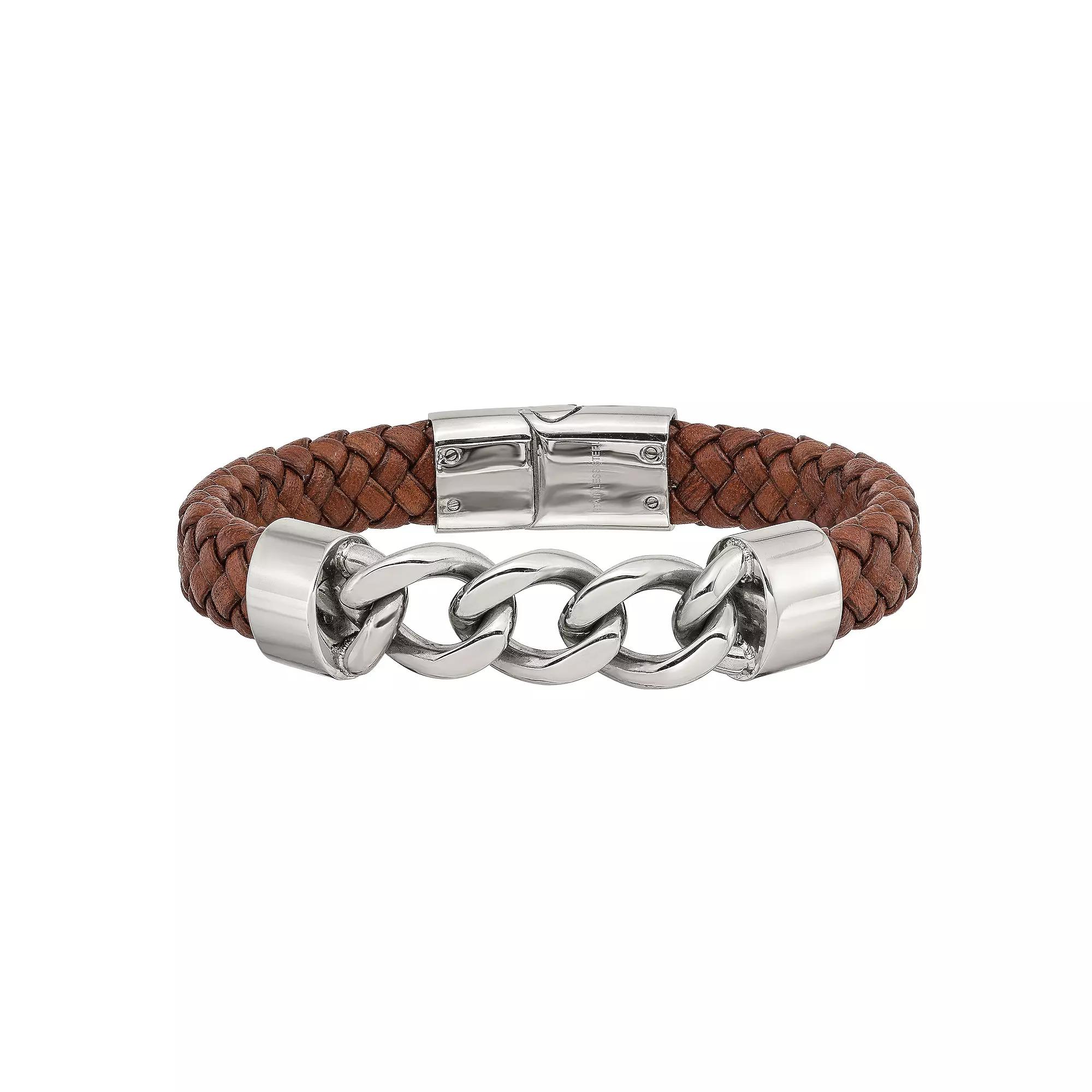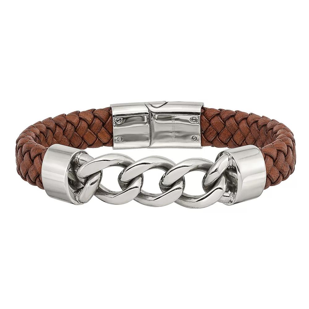 You'll love the style of this men's stainless steel polished chain and brown leather bracelet. You'll love the style of this men's stainless steel polished chain and brown leather bracelet. Closure: magnetic clasp Metal: stainless steel Length: 8.25 in. Packaging: boxed Finish: polished Size: 8.25". Gender: male. Age Group: adult. Material: Stainless Steel Leather.