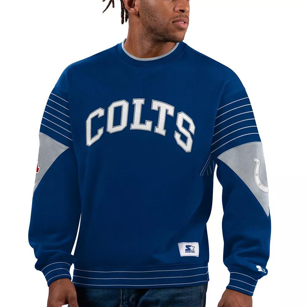 Starter updates the classic sweatshirt with this Indianapolis Colts Face-Off pullover. It features rib-knit striping that highlights the team name displayed across the front and the Indianapolis Colts logo embroidered on the left sleeve. A crew neck provides the feel of a T-shirt for comfortable wearing in cooler temps.Starter updates the classic sweatshirt with this Indianapolis Colts Face-Off pullover. It features rib-knit striping that highlights the team name displayed across the front and the Indianapolis Colts logo embroidered on the left sleeve. A crew neck provides the feel of a T-shirt for comfortable wearing in cooler temps.PRODUCT FEATURESCrew neckOfficially licensedPulloverMachine wash, tumble dry lowImportedWoven brand tagLong sleeveMaterial: 60% Cotton/40% Polyester - Body; 97% Polyester/3% Spandex - RibSublimated rib-knit insertsEmbroidered fabric appliqueFleece liningContrast-color insertsMidweight sweatshirt suitable for moderate temperaturesBrand: Starter Color: Blue. Gender: male. Age Group: adult.