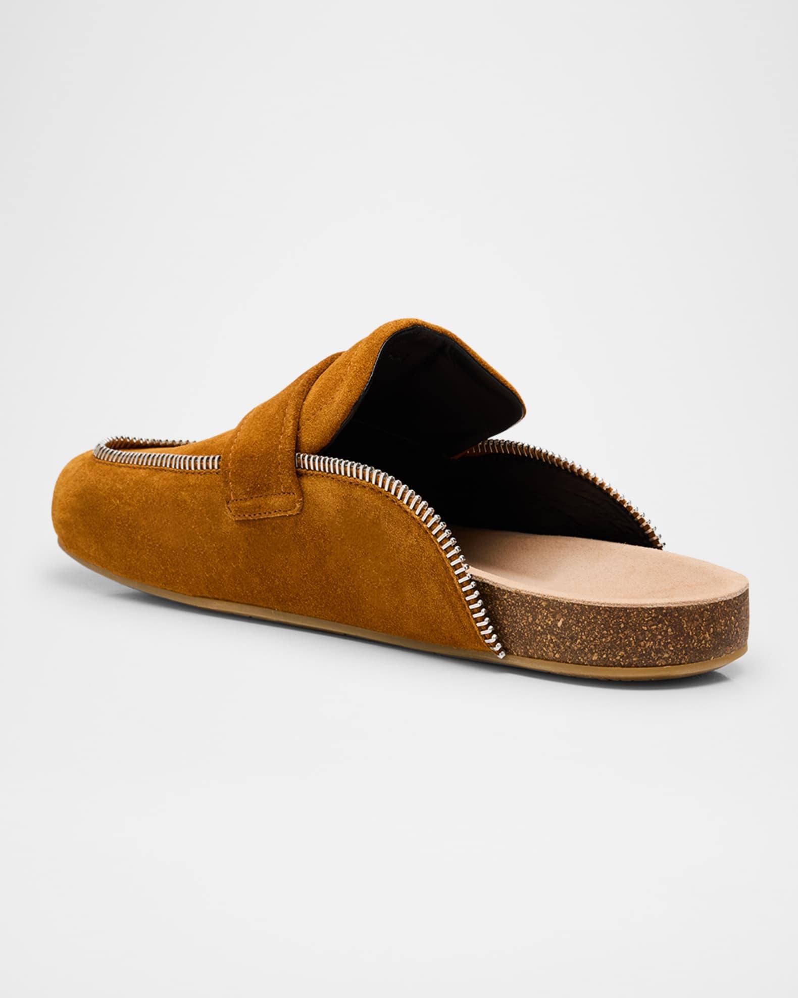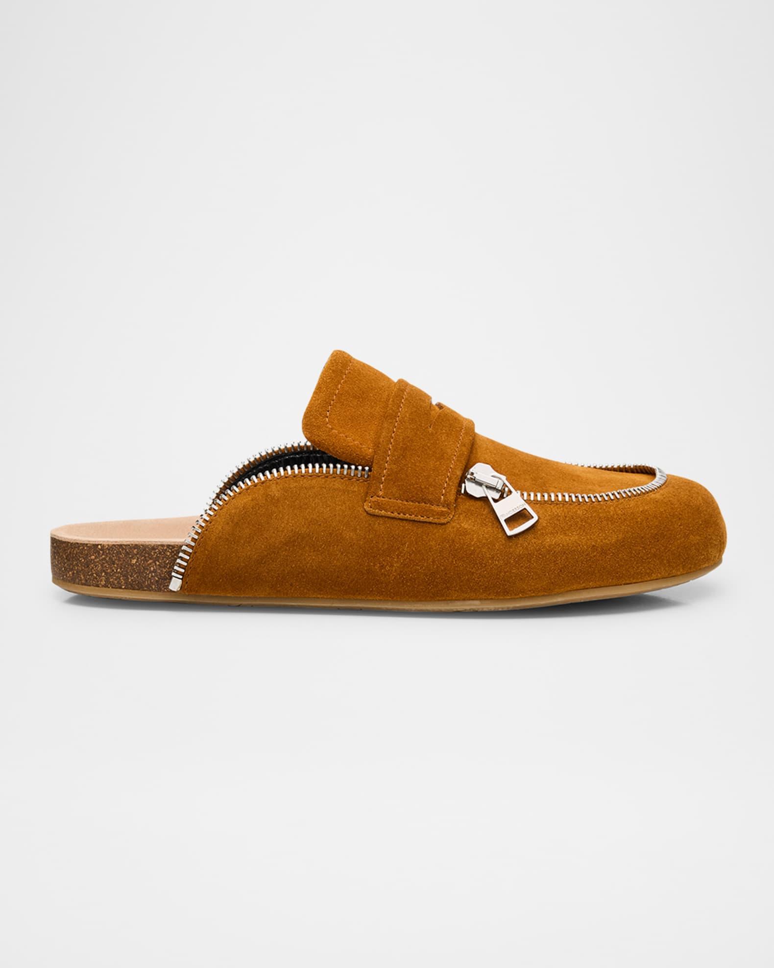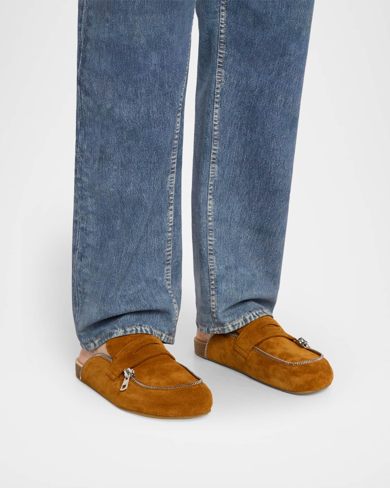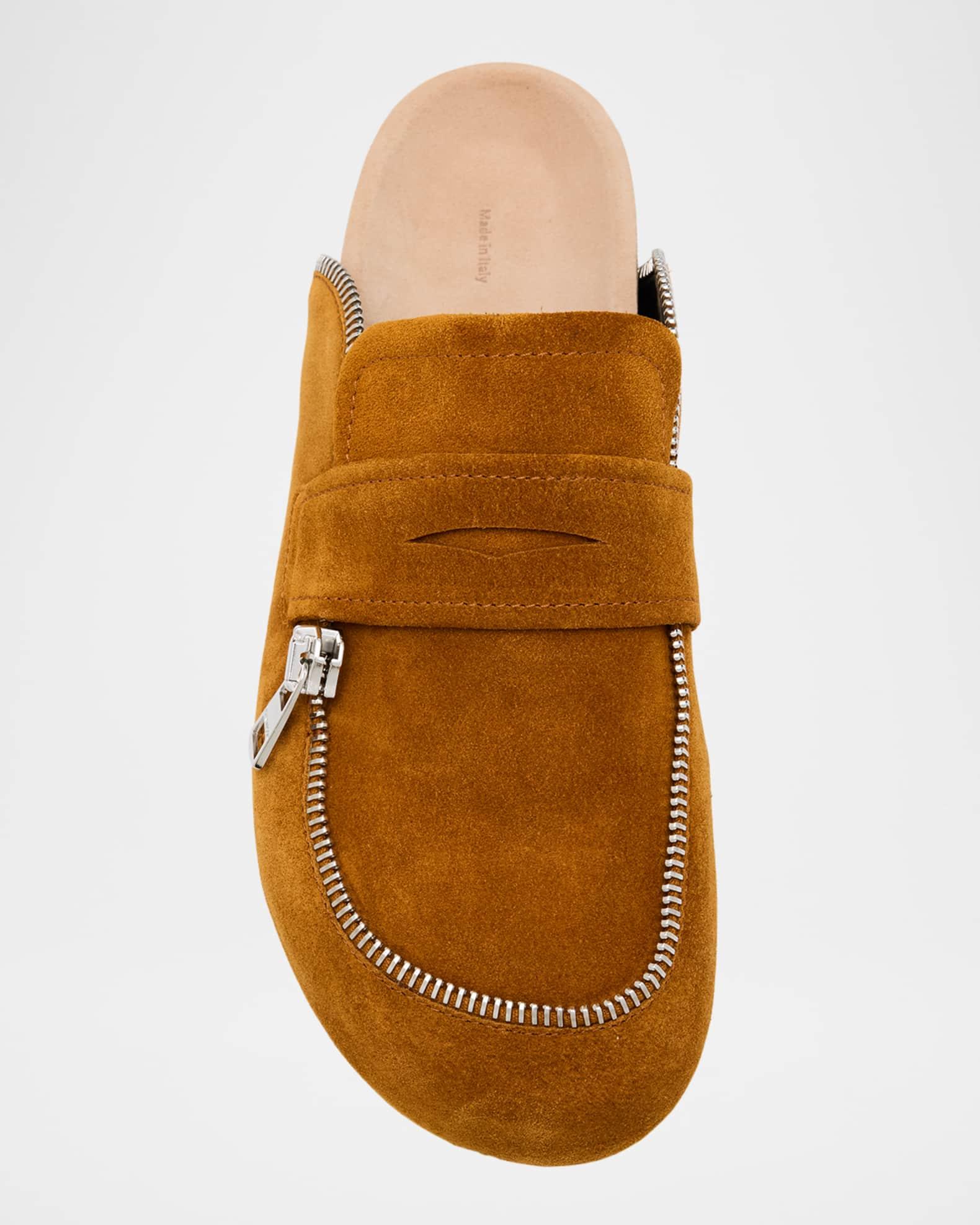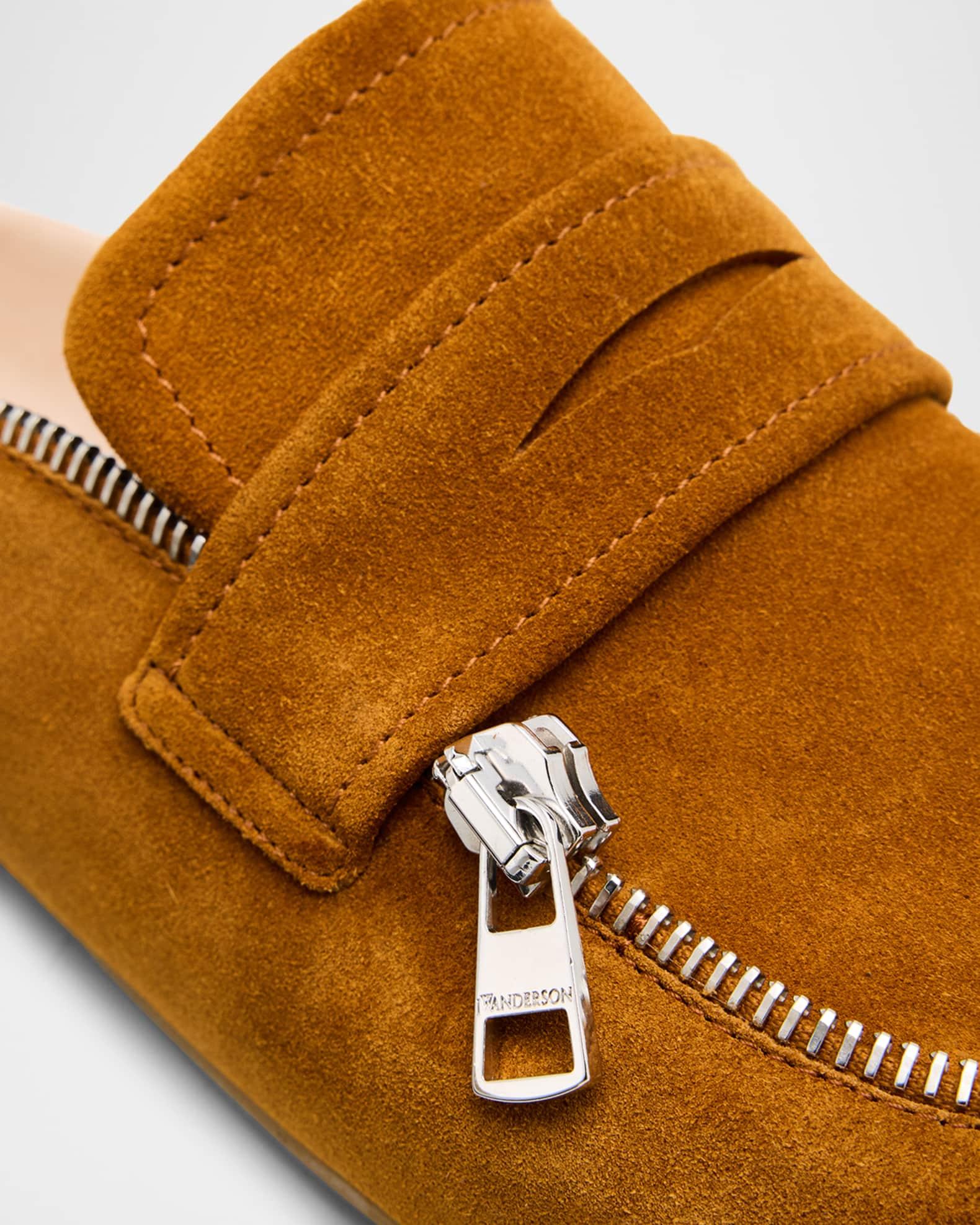 JW Anderson signature loafers in suede defined by a biker zip design Flat heel Round toe Penny keeper strap Silvertone hardware Leather lining Rubber outsole Slip-on style Wide fit Made in Italy