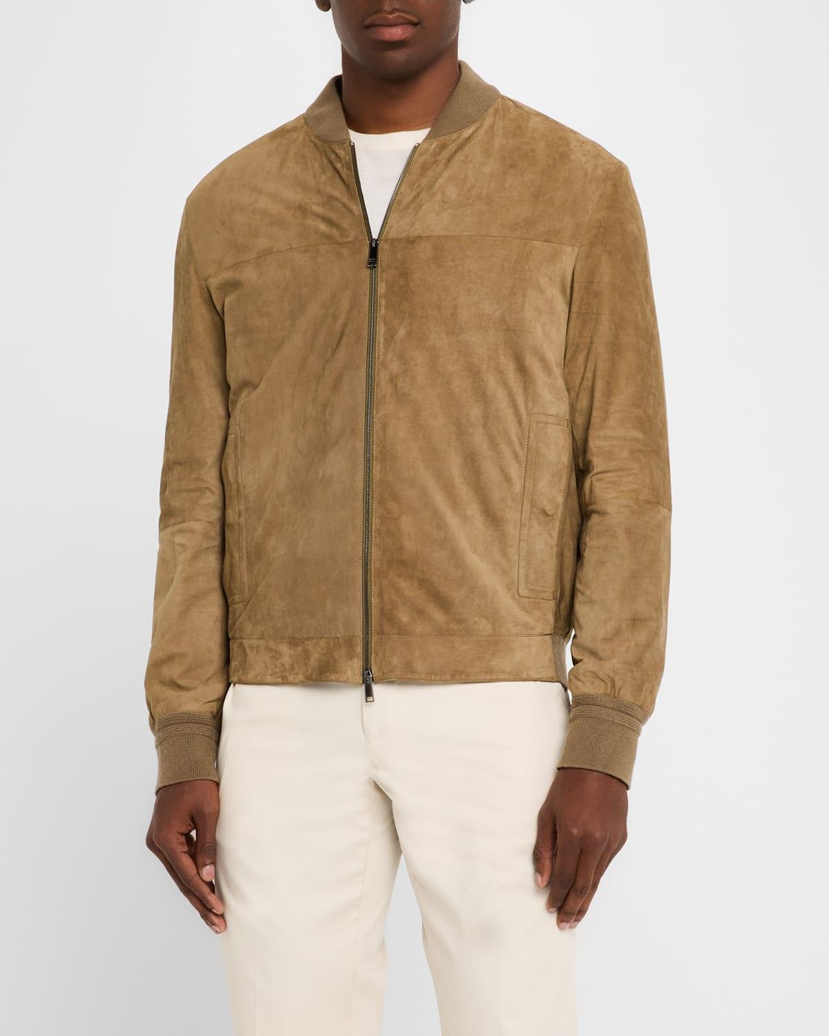ZEGNA blouson jacket in calf suede Ribbed baseball collar Two-way zip front Side welt pockets Long sleeves Ribbed cuffs and hem Leather/wool/nylon Lining: Cotton/polyester Dry clean Made in Italy Model is 6'1"/185cm.