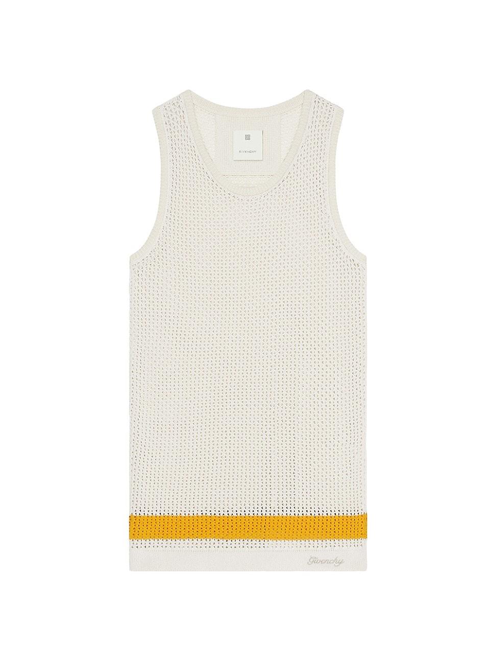 Tank top in crochet. Crew neck Signature Givenchy embroidered on the lower front Contrasting stripe on the bottom Ribbed collar, hem and armholes Composition: 70% Cotton, 30% Polyamide Made in Italy. Lsd Rtw - Givenchy Rtw > Givenchy > Saks Fifth Avenue > Barneys. Givenchy. Color: Ivory. Size: Medium.