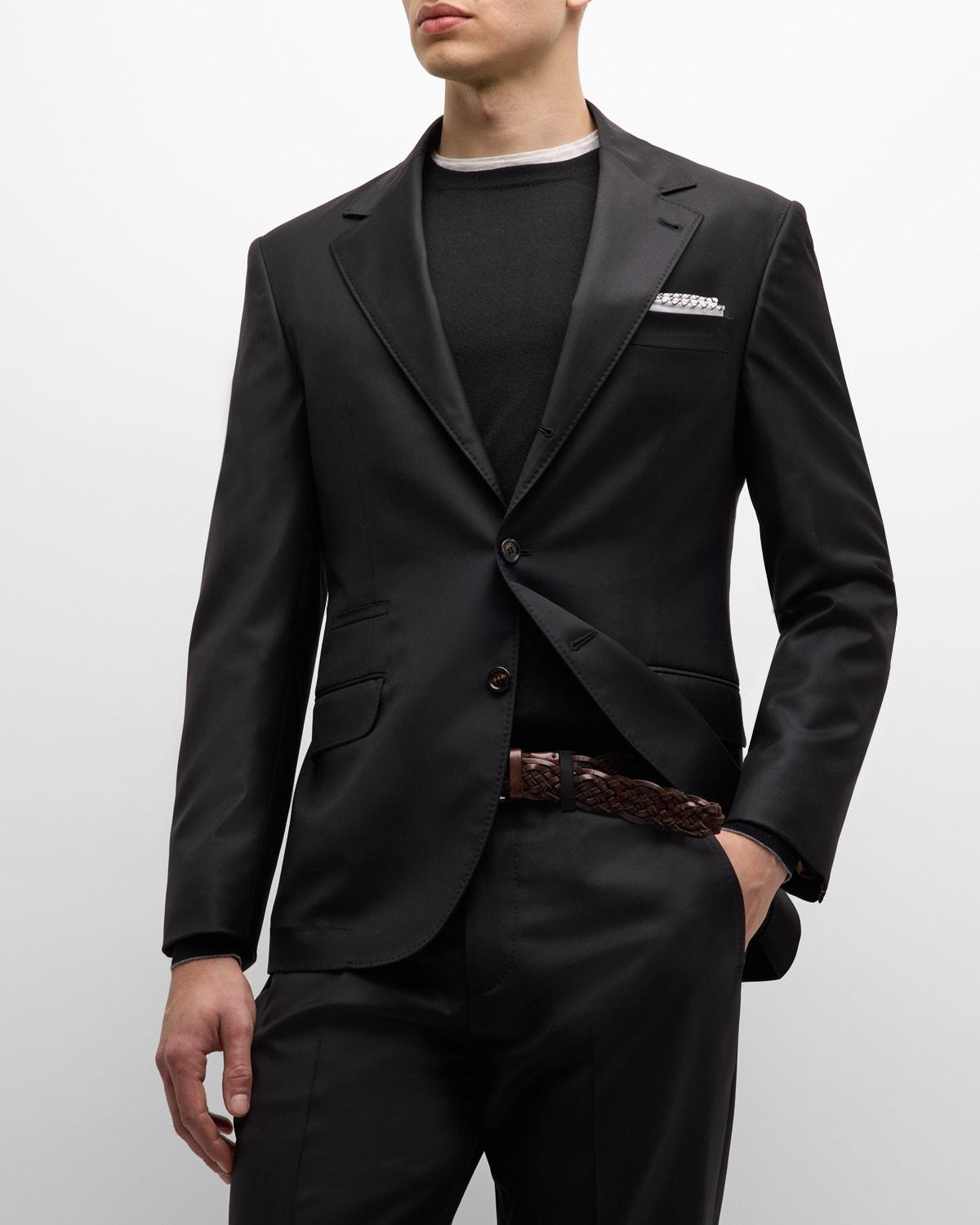 Brunello Cucinelli Tasmanian solid suit Virgin wool Lining: Acetate/cotton/cupro/viscose Dry clean Made in Italy Jacket: Notched lapels Button front Chest welt pocket; side flap pockets Unfinished sleeves Double-vented back Trousers: Regular rise Pleated front Button tab/zip closure; belt loops Side slip pockets Back welt pockets Unfinished hem to be tailored to desired length