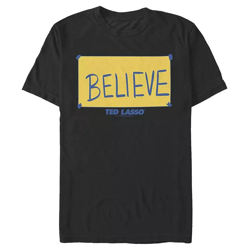 Hell love the look and feel of this Mens Ted Lasso Believe Sign Graphic Tee. FEATURES Crewneck Short SleevesFABRIC & CARE Cotton Machine wash Imported Color: Black. Gender: male. Age Group: adult. Material: Cotton Blend.