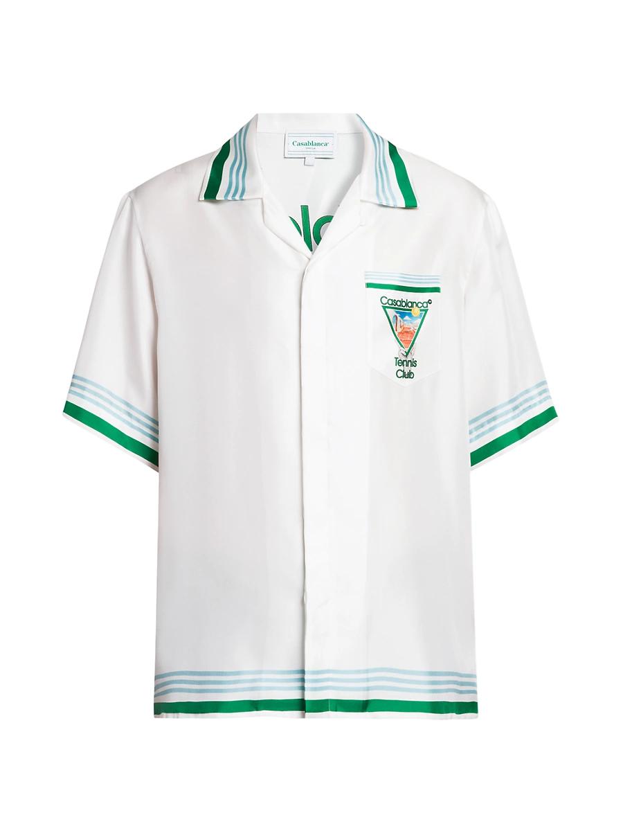 Crafted of silk, this button-front shirt is adorned with a signature Casablanca Tennis Club logo motif at the chest patch pocket and reverse. Striped trim lends a retro feel to this style. Cuban collar Short sleeves Chest patch pocket Button-front closure 100% silk Dry clean Made in Italy SIZE & FIT Model measurements: 62 tall, 40 chest, 31 waist Model is wearing a US size Medium. Mens Adv Contemporary - Advanced Contemp Collect > Casablanca > Saks Fifth Avenue > Barneys. Casablanca. Color: Metaphysical Tennis Icon. Size: XL.