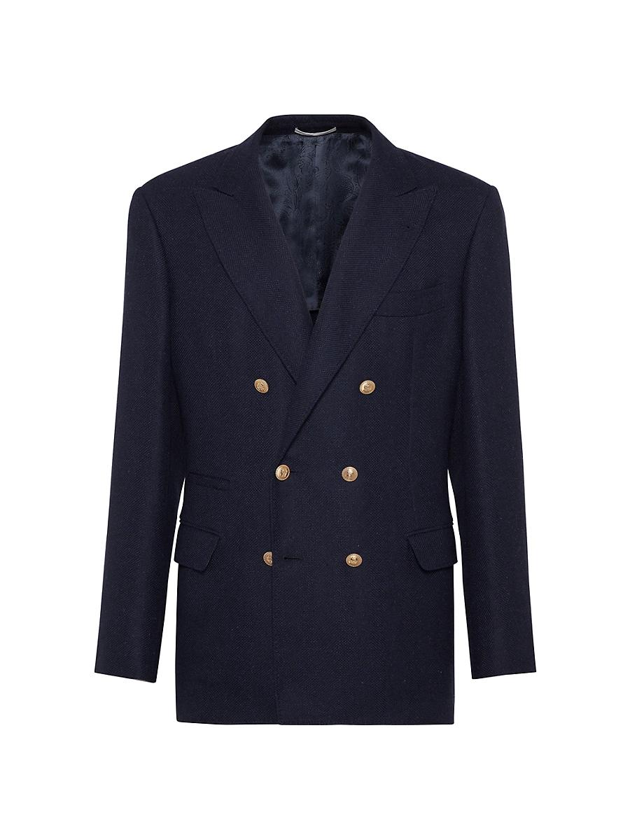 Linen, silk, wool and cotton textured stripe diagonal one-and-a-half-breasted deconstructed blazer with peak lapels and metal buttons. 6 metal button closure Peak lapel Welt pockets with flap, ticket pocket and chest pocket Cuffs have four metal buttons and functional buttonholes Half-lined Two interior pockets with button closure and pen holder Double back vent Drop 7 Request dry cleaning at specialist cleaners only, do not bleach. Do not tumble dry, iron at low temperature 43%l inen / 21% silk / 21% wool / 15% cotton Made in Italy. Lsd Rtw - Brunello Cucinelli Rtw > Brunello Cucinelli > Saks Fifth Avenue > Barneys. Brunello Cucinelli. Color: Navy Blue. Size: 34.