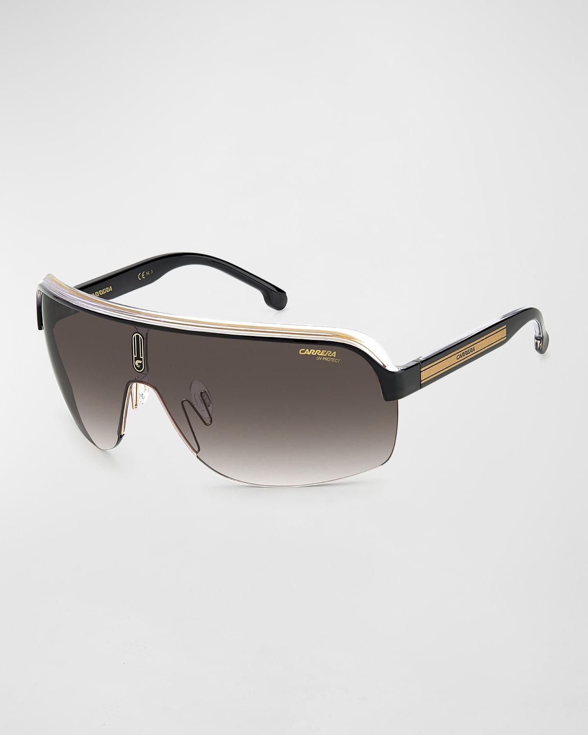 Carrera "Topcar 1/N" shield sunglasses features C-logo insert at center nose bridge Eye/bridge/temple (in mm): 99-01-115 Gradient lens with logo script Half-rim frames Saddle nose bridge Adjustable nose pads Stripe logo lettering at temples Tapered arms; curved temple tips Plastic 100% UVA/UVB protection Imported