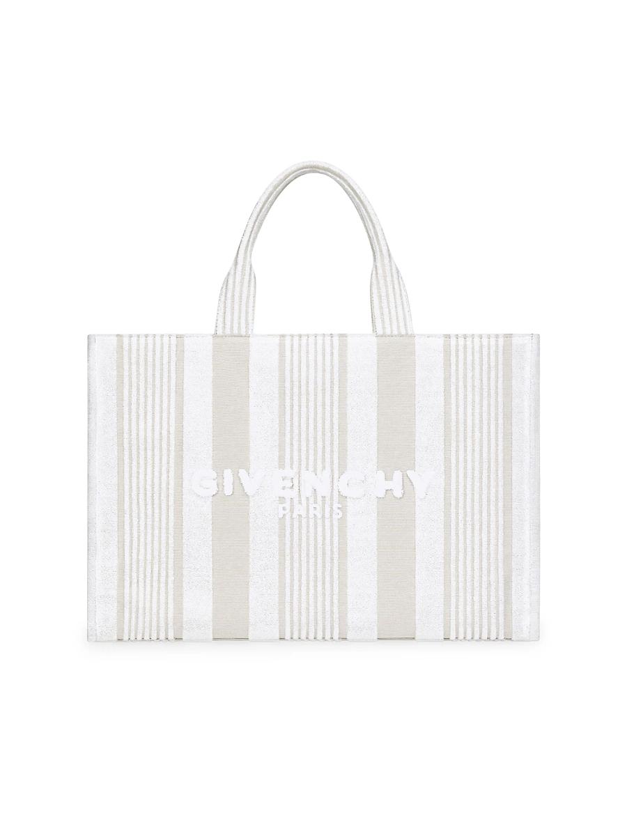 Givenchy tote bag in cotton towelling with stripes. Tote bag in jacquard cotton towelling to be carried by hand Striped pattern Raised Givenchy signature on the front One large flat pocket inside Suede lining 17.72 in x 12.2 in x 5.91 in. Composition: 87% cotton 13% polyamide, Secondary material: 100% calfskin leather, Lining: 87% cotton, 13% polyamide Made in Italy. Lsd Rtw - Givenchy Rtw > Givenchy > Saks Fifth Avenue > Barneys. Givenchy. Color: Ivory.