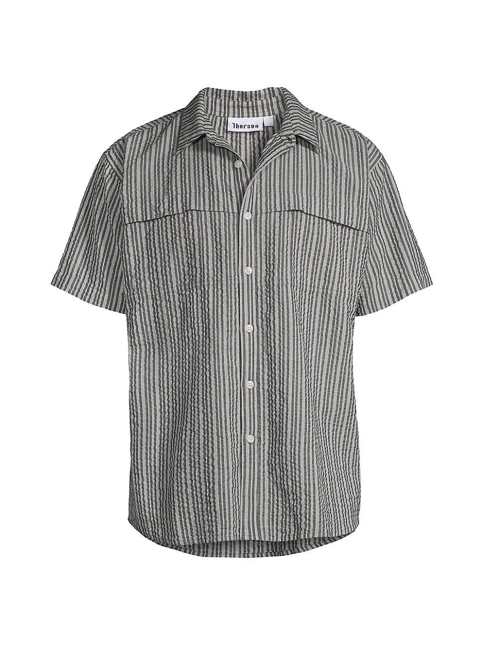 Crafted of cotton, this striped seersucker Travel shirt from Thorsun features a spread collar, short sleeves, and a button-front closure. Spread collar Short sleeves Button-front closure 100% cotton Dry clean Imported SIZE & FIT About 30.5 from shoulder to hem Model measurements: 62 tall, 40 chest, 31 waist Model is wearing a US size Medium. Mens Modern Coll & Outer - Swim Lifestyle > Thorsun > Saks Fifth Avenue > Barneys. Thorsun. Color: Stripped Blue. Size: Medium.