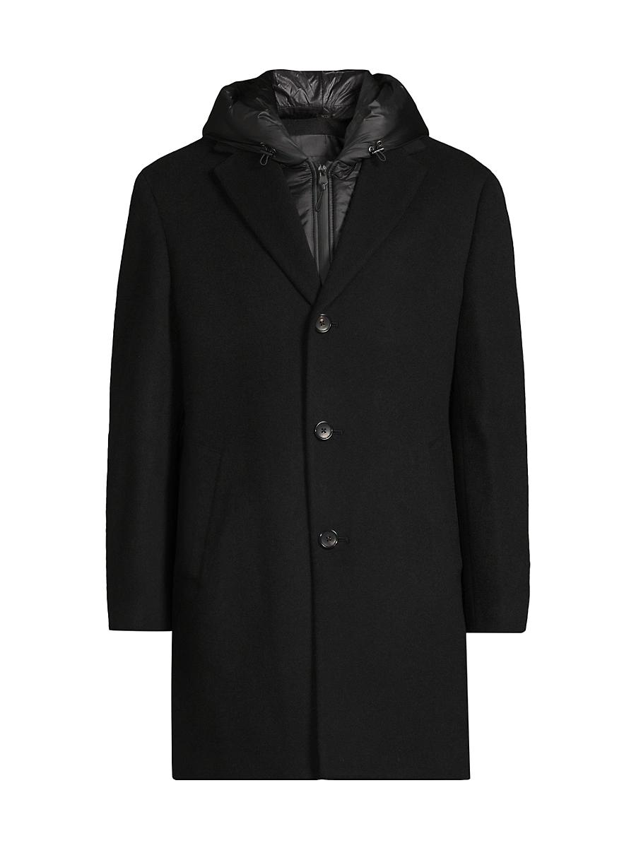 Cardinal of Canada Trenton solid topcoat featuring a removable hooded bibfilled with primaloft insulation Notched lapels; single-breasted front Broad welt side pockets Regular fit Four-button sleeve finish Single back vent Wool/cashmere Fully lined Dry clean Imported