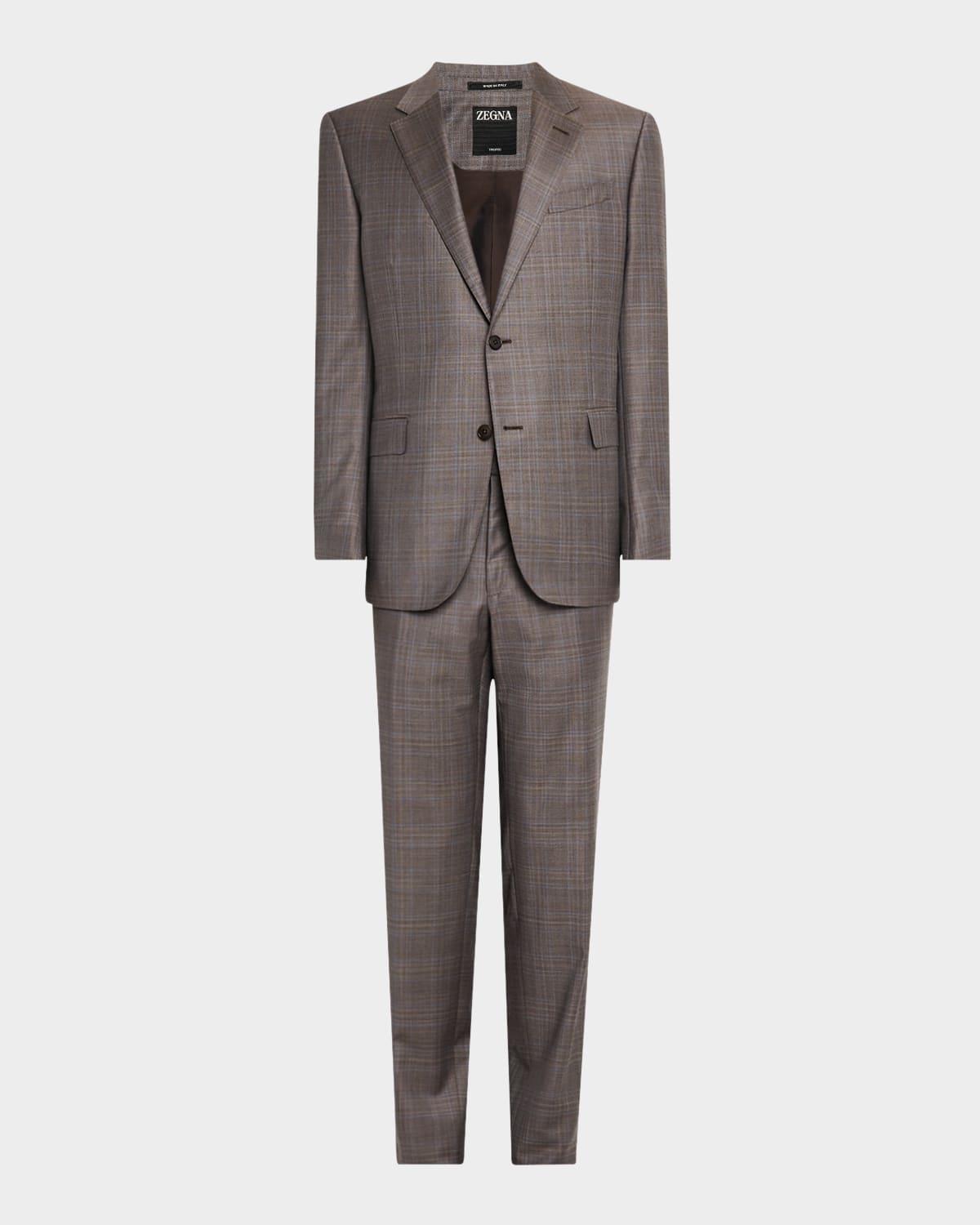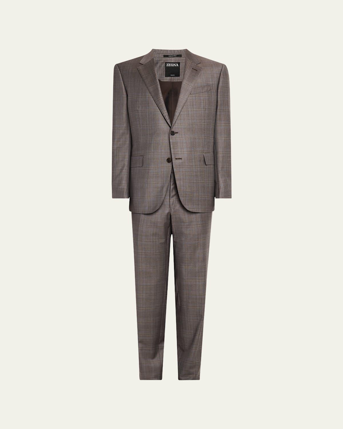 ZEGNA suit in mélange plaid Notched lapels Two-button closure Chest welt pocket Side flap pockets Interior welt pocket Unfinished sleeves Double-vented back Darted trousers Straight legs Superfine Trofeo™ wool Dry clean Made in Italy