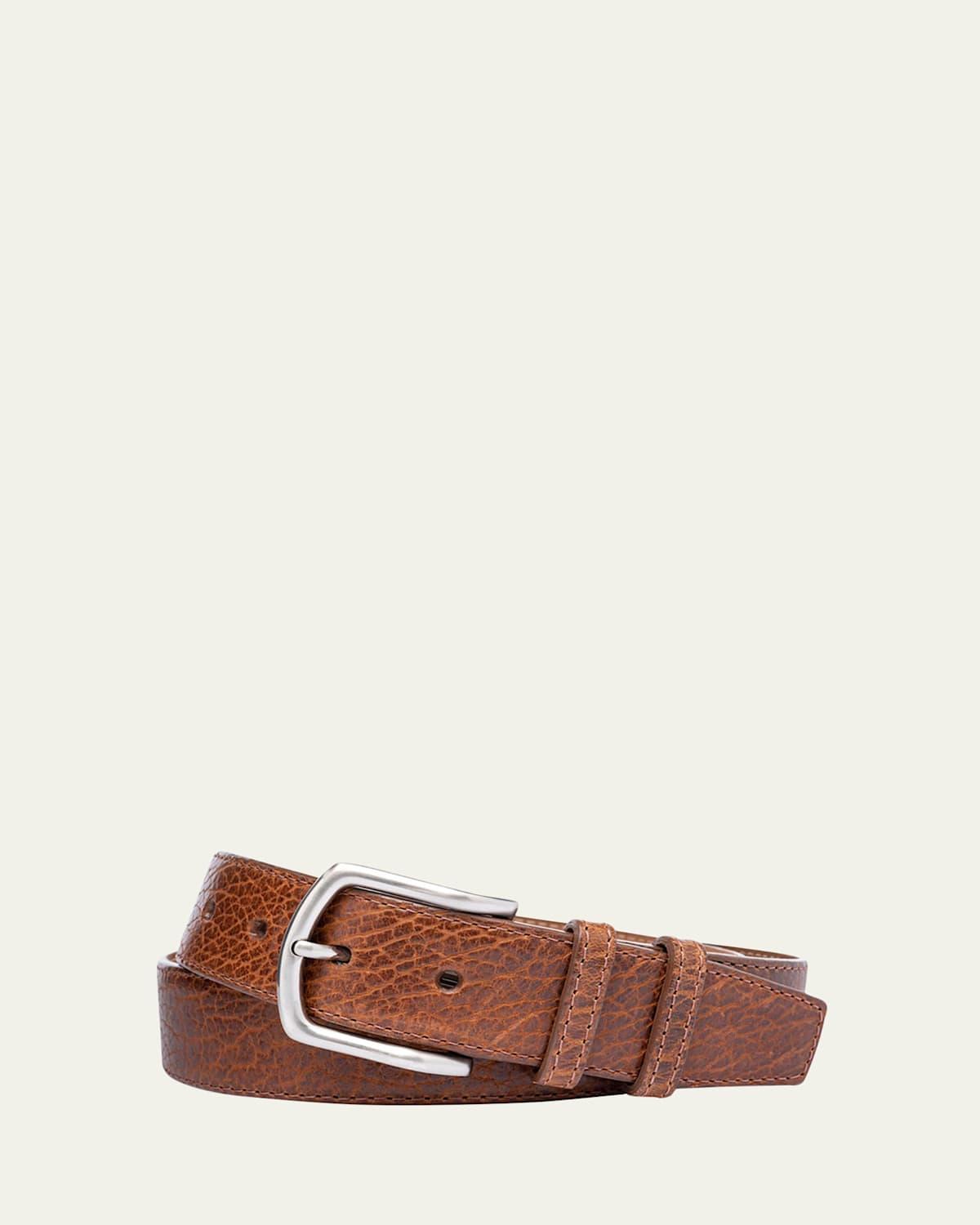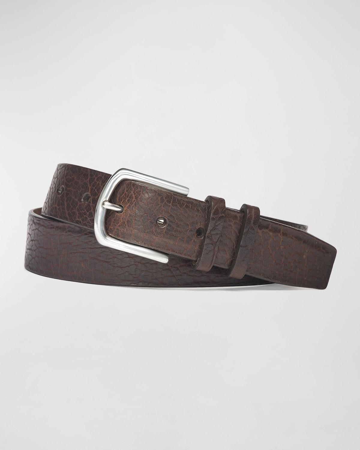 W. Kleinberg "Tucson" belt in American bison. Polished nickel buckle. Nubuck lined. Approx. 1.4" wide. Made in USA.