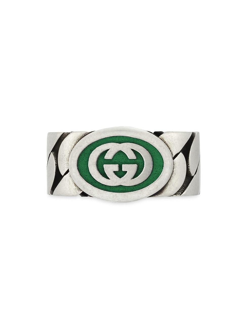 This Gucci ring in sterling silver showcases green enamel with interlocking G detail and a chain-link design. From the Interlocking G Collection Green enamel Sterling silver Made in Italy SIZE Width, 9mm ABOUT THE BRAND First launched in 1921, the Italian luxury fashion house quickly became known for its fine leather craftsmanship and accessories. Today, the visionary brand continues to redefine fashion trends, while celebrating creativity and innovation. Guccis contemporary designs include shoes, clothing and accessories-often boasting the distinctive Horsebit motif. Men Accessories - Jewelry > Gucci > Saks Fifth Avenue > Barneys. Gucci. Color: Silver Green. Size: 9.