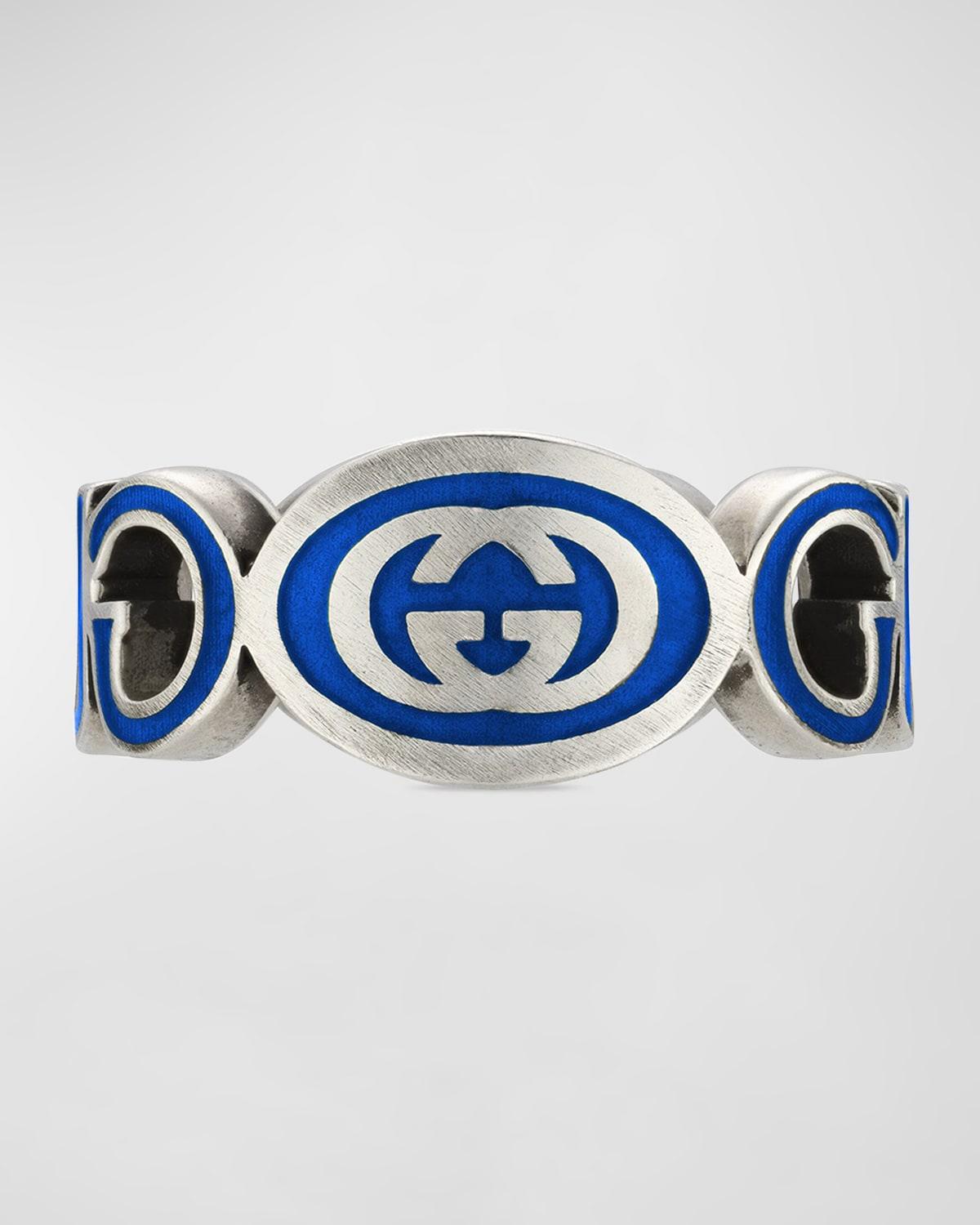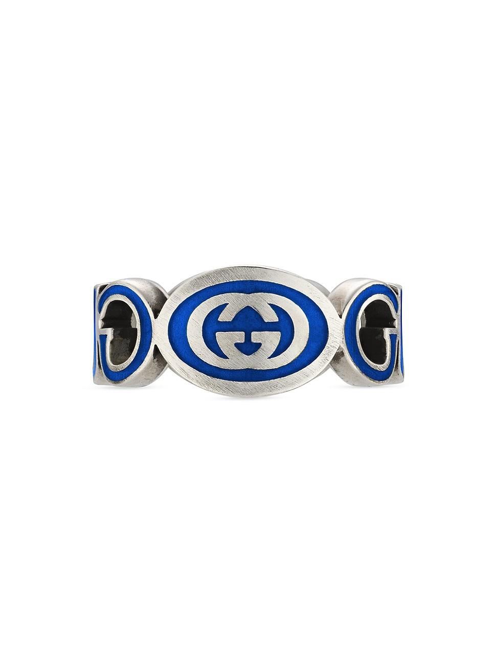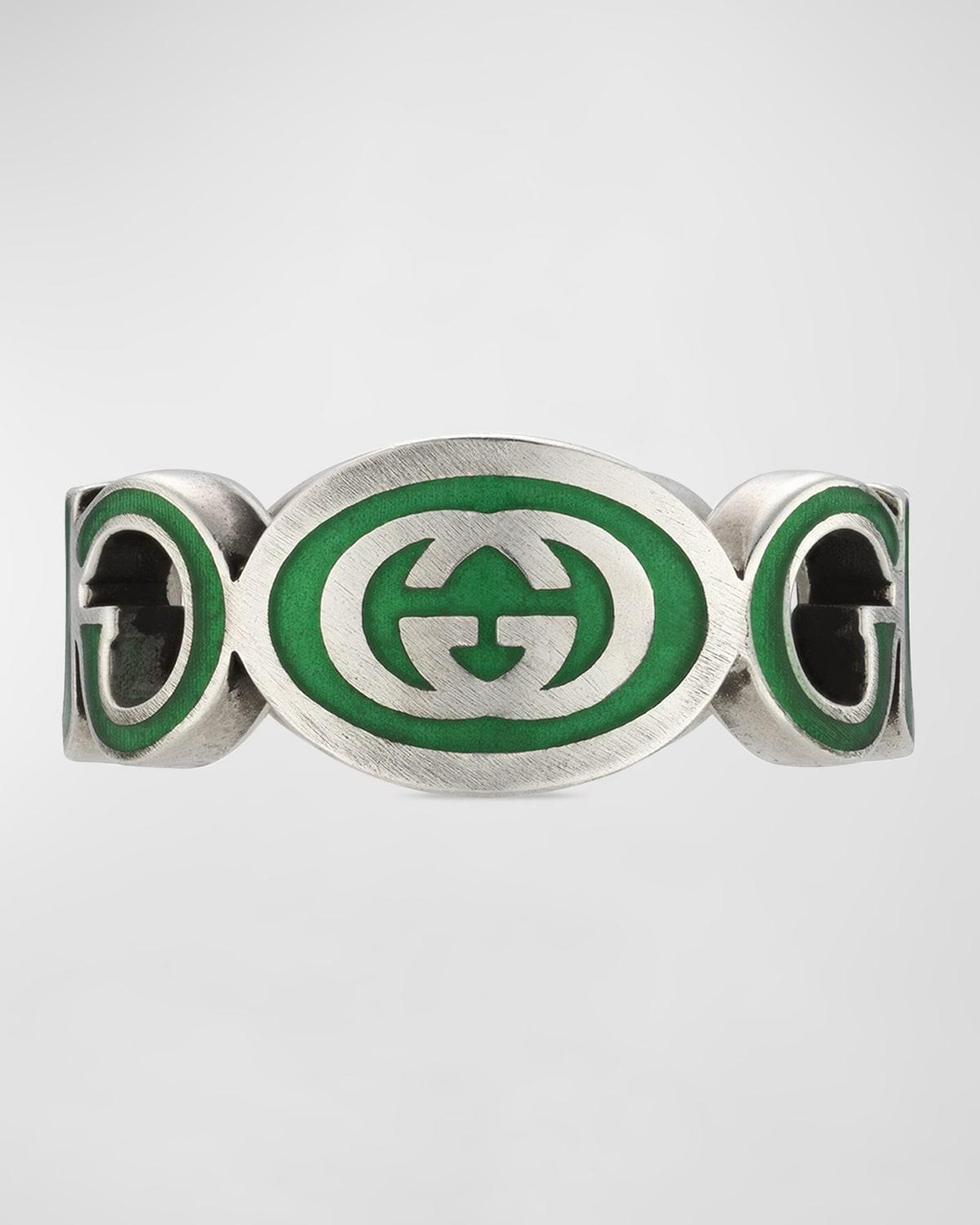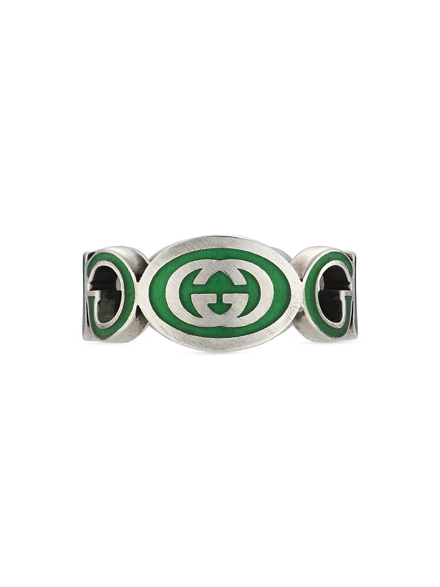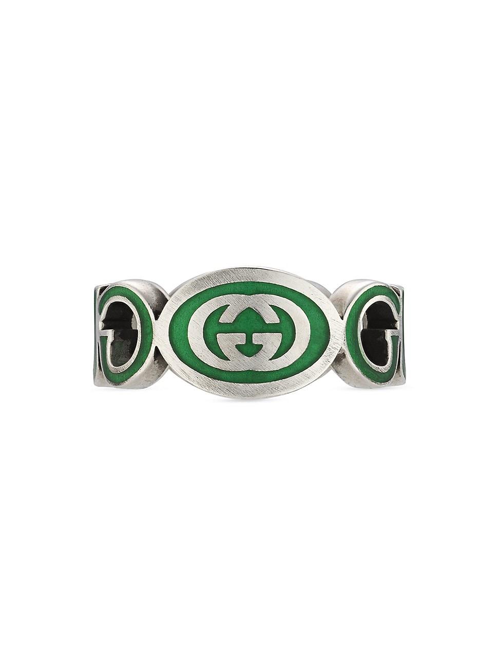 A cut-out Gucci logo design defines this sterling silver ring, accented with enamel interlocking G details. Sterling silver Enamel Made in Italy SIZE Band: about 10mm W ABOUT THE BRAND First launched in 1921, the Italian luxury fashion house quickly became known for its fine leather craftsmanship and accessories. Today, the visionary brand continues to redefine fashion trends, while celebrating creativity and innovation. Guccis contemporary designs include shoes, clothing and accessories-often boasting the distinctive Horsebit motif. Men Accessories - Jewelry > Gucci > Saks Fifth Avenue > Barneys. Gucci. Color: Silver Green. Size: 10.