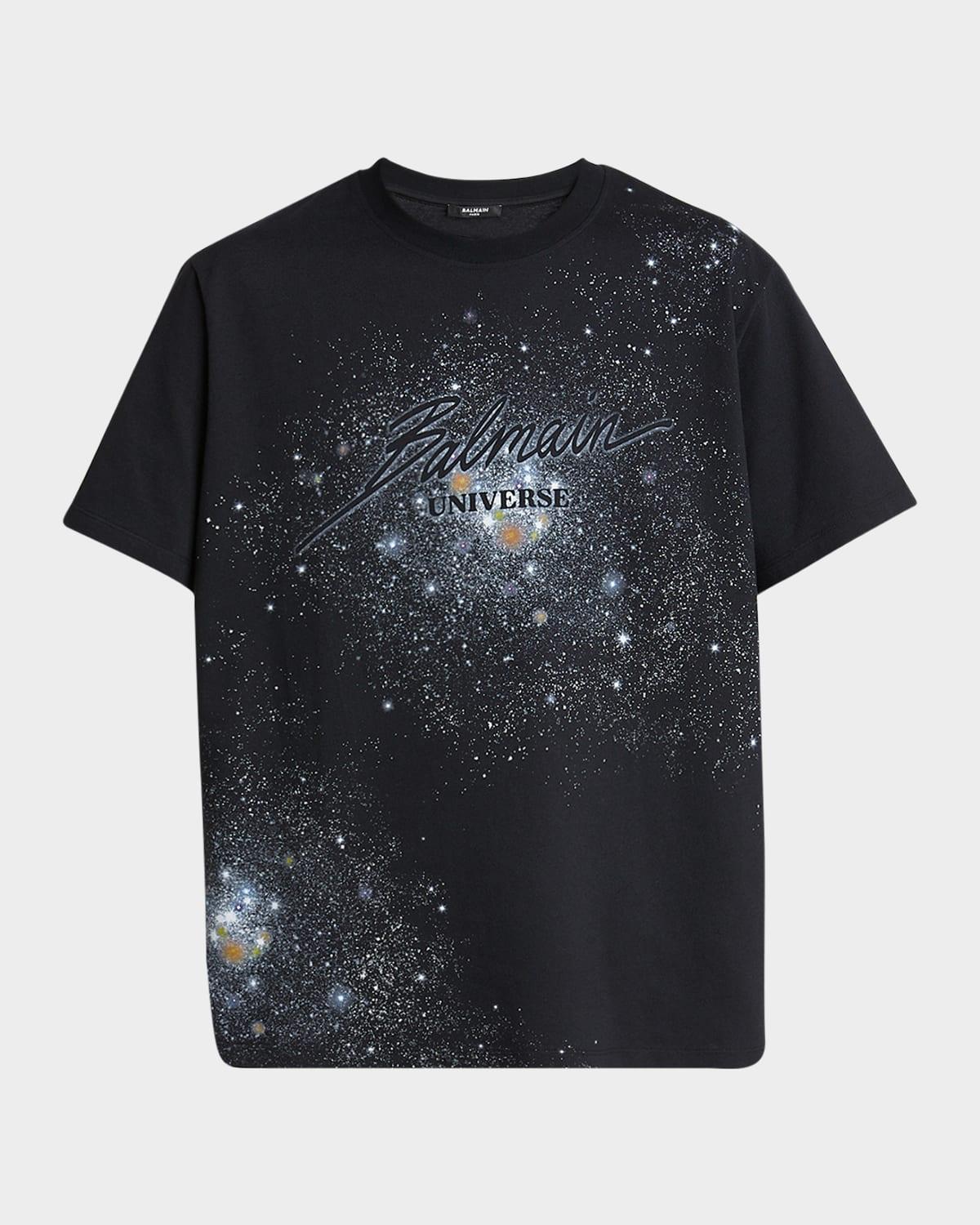 Balmain T-shirt featuring luminous universe prints on front and back Crew neckline Short sleeves Regular fit Pullover style Cotton Professional cleaning recommended Made in Portugal