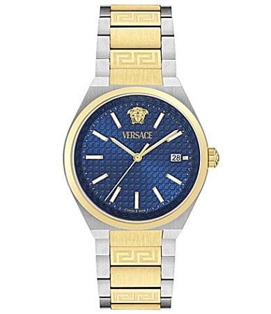 This sleek V-Auria timepiece designed by Versace boasts luxe style, featuring stick hour markers and bar indices. A Medusa head at the 12-hour mark and Greca engravings on the bezel complete this stainless steel watch. Swiss quartz movement Fixed bezel Sapphire crystal Push-pull crown Blue guilloch dial Stick hour markers Date display at 3 oclock Two-tone stainless steel case and bracelet Deployant buckle Made in Switzerland FEATURES Water resistant to 5 ATM SIZE Round case: about 39mm (1.5) ABOUT THE BRAND Founded in 1978, Versace is instantly recognizable by the signature Medusa head logo, chosen by founder Gianni Versace for its Greek symbolism. The Italian label is known for its luxe, bold clothing, sneakers, shoes and accessories-think gilding, oversized logos and punchy prints. Since taking over artistic direction, Giannis sister Donatella Versace has maintained the brands strong identity, with a renewed vision to give customers the ultimate freedom to express themselves. Men Accessories - Watches > Versace > Saks Fifth Avenue > Barneys. Versace. Color: Two Tone Blue.