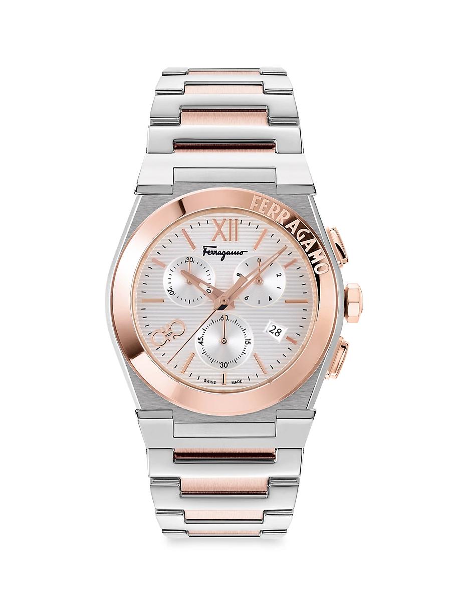 Salvatore Ferragamo Vega Chrono mens Gancini watch Approx. 164.1mmlength 42mm; round two-tonestainless steelcase Debossed logo at bezel White guilloch dial Baton indices Three center subdials Logo lettering at 12 oclock Date windowat 4oclock Double Ganciniat 8 oclock F-logo embossed crown Three-link silvertone/rose gold-tonestainless steel bracelet Double Gancini deployant closure Three hand Swiss quartz movement Water resistant to.