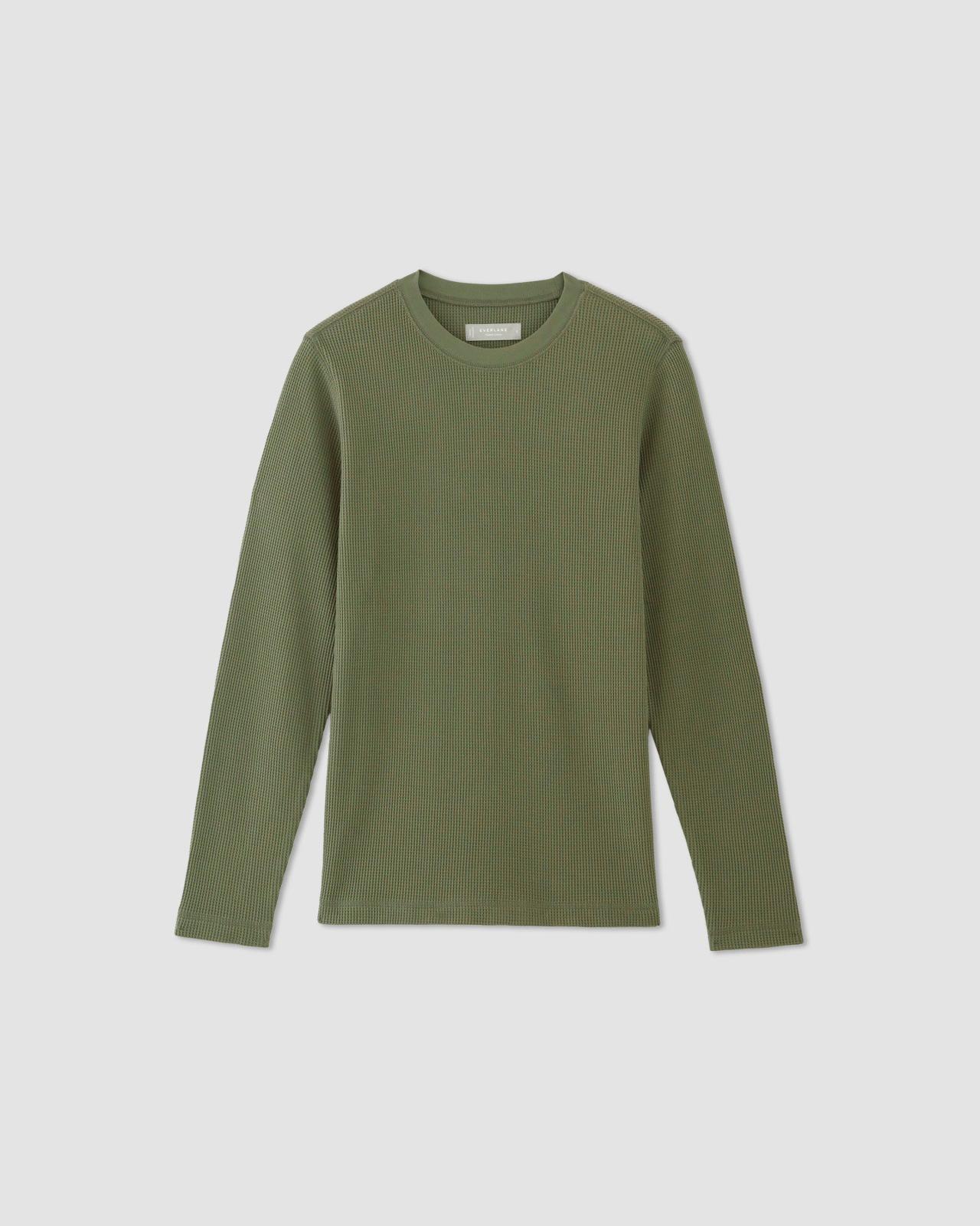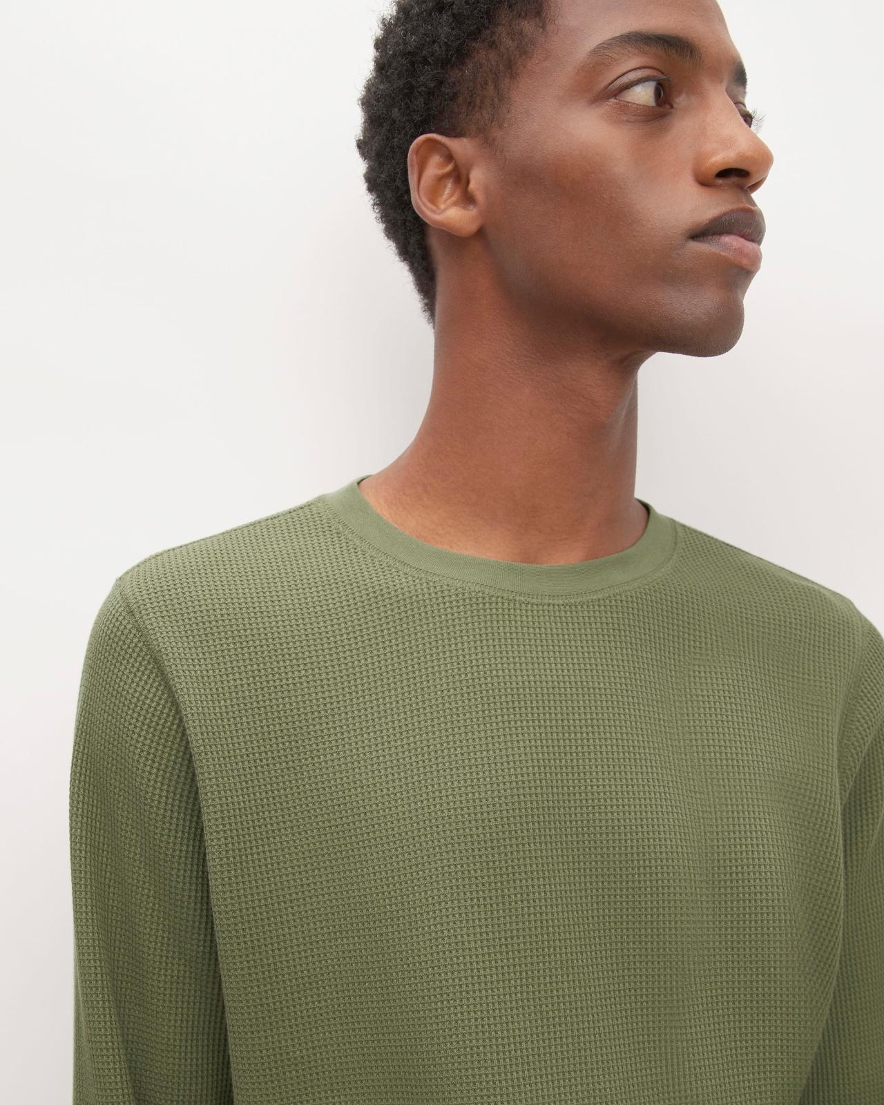 Organic cotton crew. The Waffle Long-Sleeve Crew is a fresh take on this iconic style made with our soft breathable 100% organic cotton waffle fabric. Featuring a slim fit and ribbed neckline and a waffle texture flat-lock stitched seams add extra detailing. Everlane has been a GOTS-certified brand since 2019. The initial Global Organic Textile Standard (GOTS) certification takes over a year to complete to account for every step of productionfrom the processing of certified organic fiber into yarn to the dyehouses mills factories and printers. We are audited annually to verify traceability throughout our entire supply chainensuring that our GOTS-certified products pass all ecological and social standards. Mens Waffle Long-Sleeve Crew Neck T-Shirt by Everlane in Olive, Size M