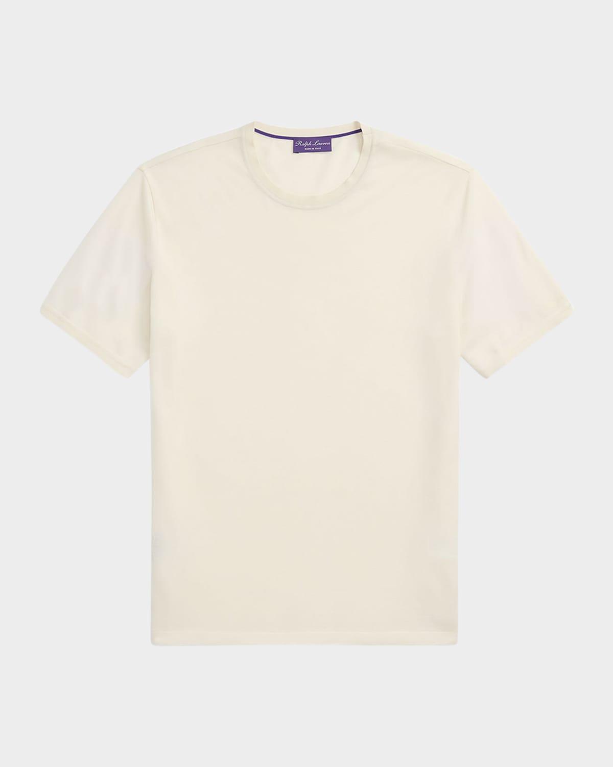 Ralph Lauren T-shirt crafted with wool piqué fabric Approx. 28"L from shoulder to hem Crew neckline Short sleeves with ribbed armbands “Ralph Lauren” script embroidery on left sleeve Even vented hem Pullover style Hand wash or dry clean Made in Italy Size medium has a 28" body length (front and back), a 17.5" shoulder, and a 39" chest. Model is 6'1" (185 cm) and wears a size medium.